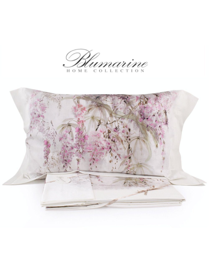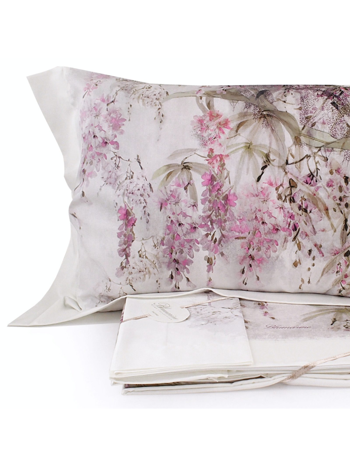 Questo copripiumino matrimoniale presenta una delicata fantasia floreale, con delicati mazzi di glicine distribuite su uno sfondo chiaro.
