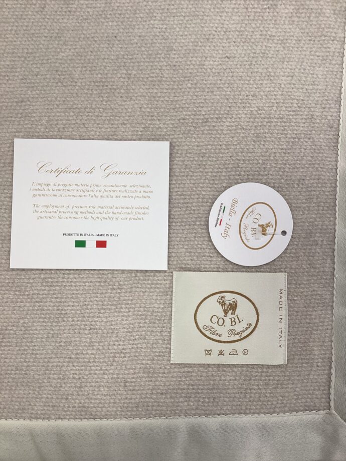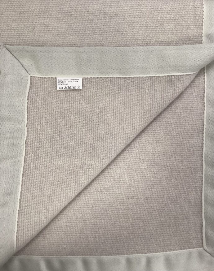 Marchio Co.Bi., coperta primaverile singola con dimensione 160×220 cm., 80% lana e 20% mohair, peso 290 gr/mq. Double-face è rifinita con bordo in tessuto a contrasto. E’ di colore lilla chiaro.