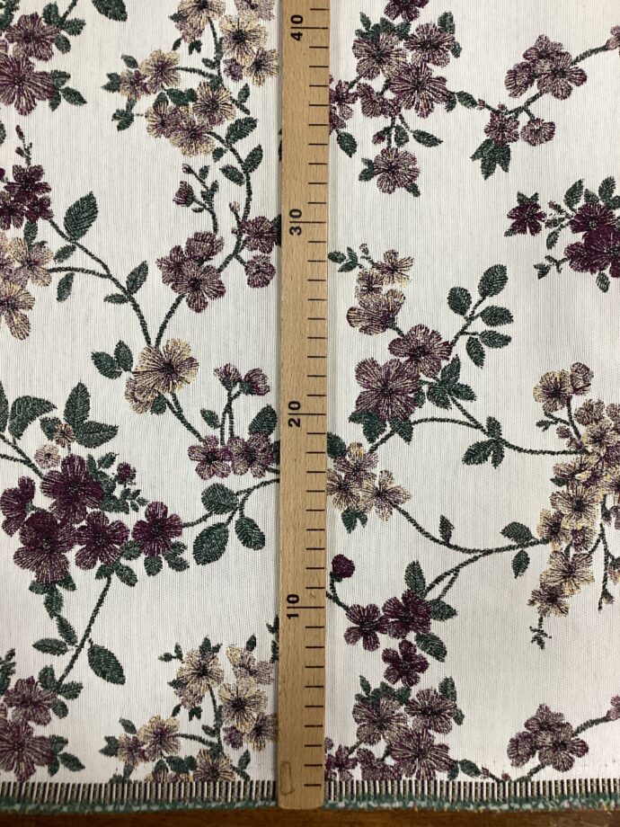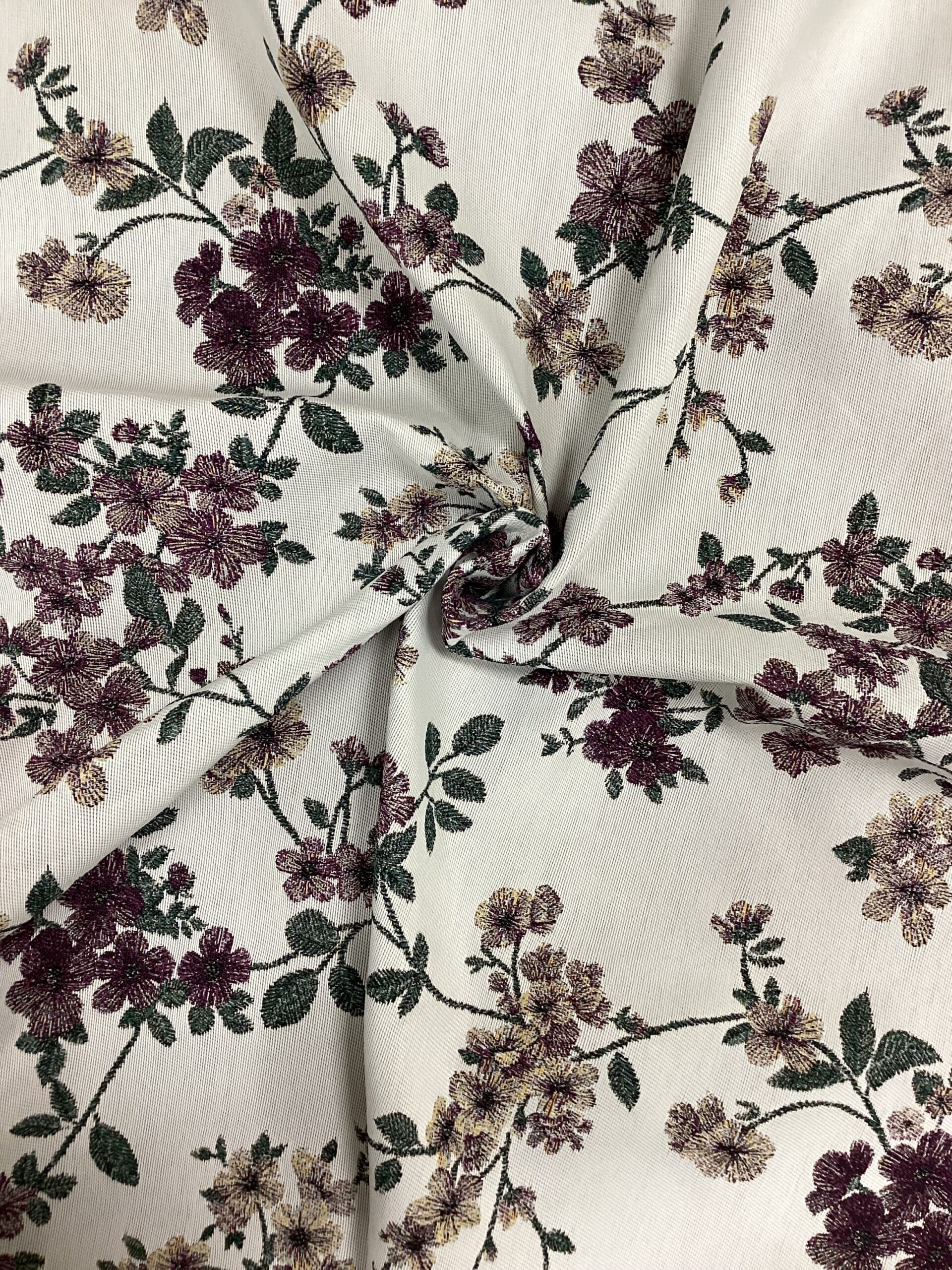 Un tessuto con fondo chiaro, arricchito da fiori colorati ricamati, offre un aspetto fresco e vivace. I fiori, dai toni vibranti come il giallo e il violetta sono delicatamente intrecciati con foglie verdi, creando un contrasto armonioso e naturale. La lavorazione ricamata aggiunge profondità e texture al tessuto, donando eleganza e dinamismo. Questo tipo di tessuto è perfetto per ambienti luminosi, ideale per cuscini o rivestimenti che richiedono un tocco di colore e freschezza.