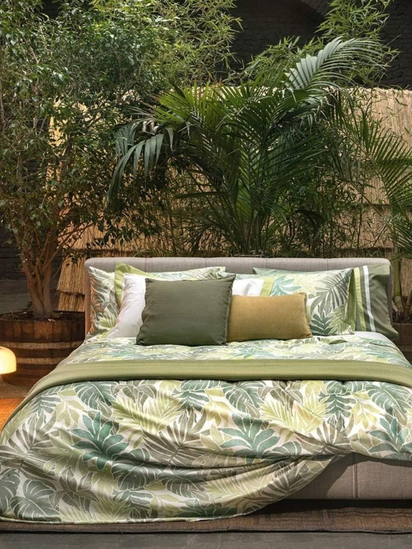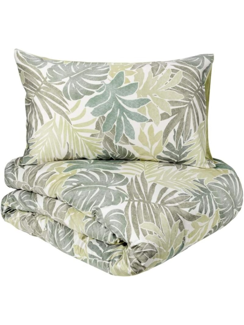 Dona un tocco di eleganza e freschezza alla tua camera da letto con questa parure copripiumino dal design raffinato. Il set è caratterizzato da un copripiumino e due federe decorati con foglie di diverse misure e sfumature si stagliano su uno sfondo neutro. I dettagli aggiungono un tocco di dinamismo, perfetto per creare un’atmosfera vivace.