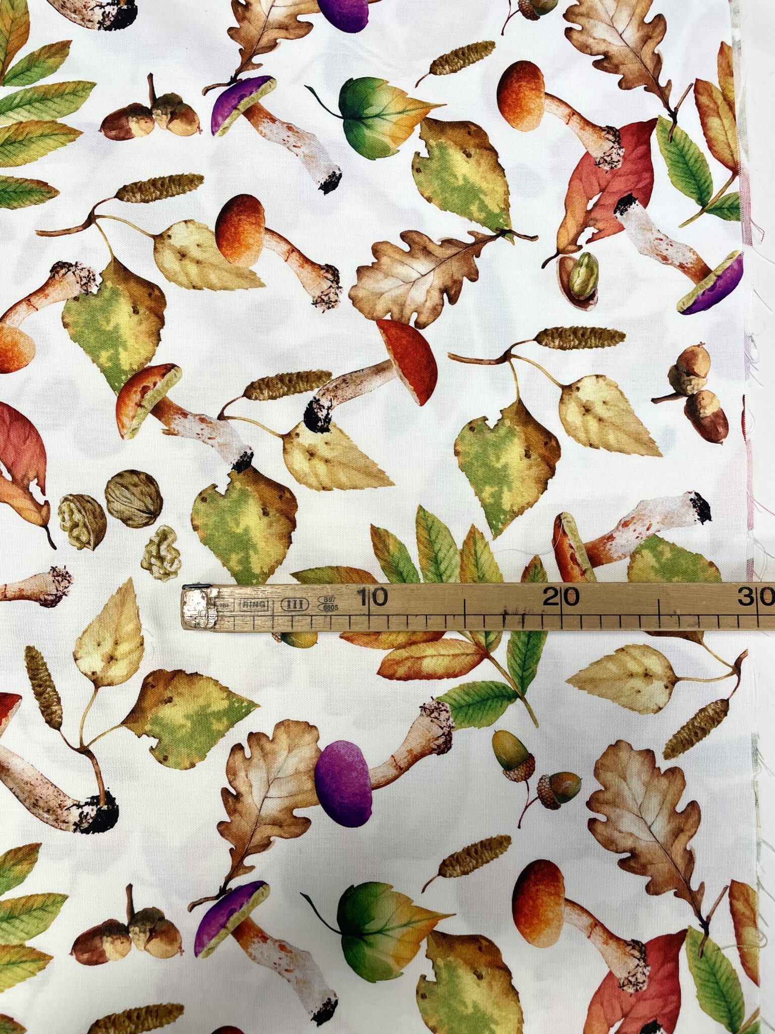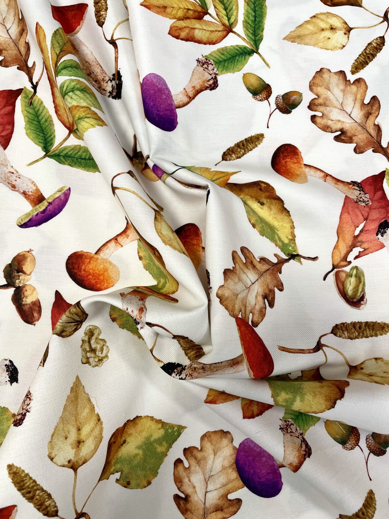 Immergiti nell’atmosfera di un bosco autunnale con questo tessuto 100% cotone, progettato per portare un tocco di natura direttamente nella tua casa. Il design raffinato e vivace, con una fantasia di funghi e foglie, cattura i caldi colori dell’autunno, dal verde muschiato all’arancione e marrone dei funghi, regalando un’esperienza visiva che evoca le passeggiate tra i boschi in cerca di funghi.