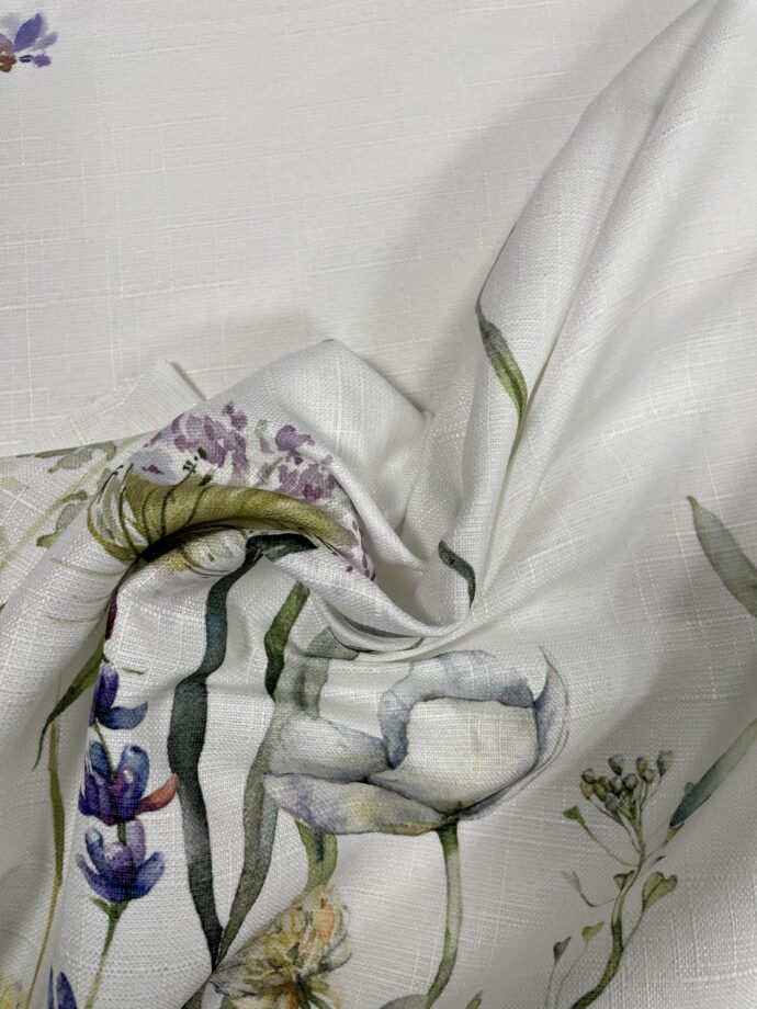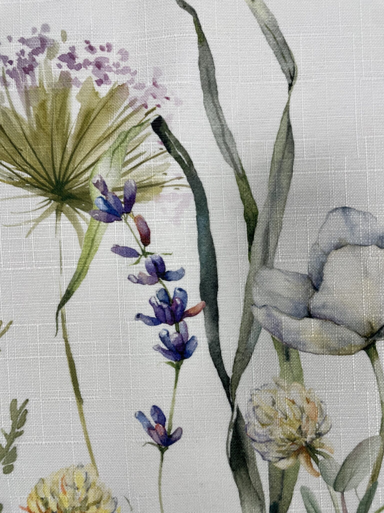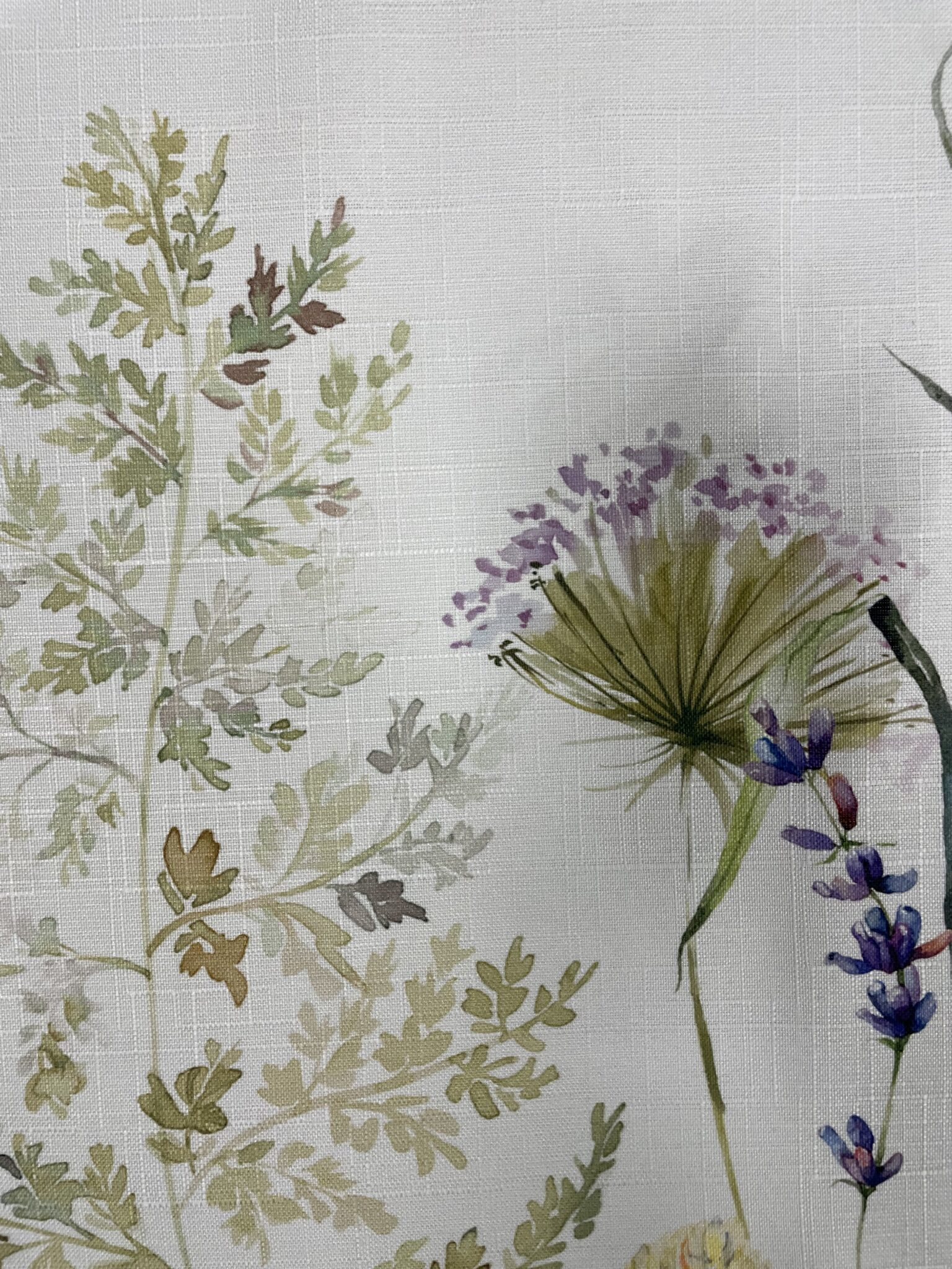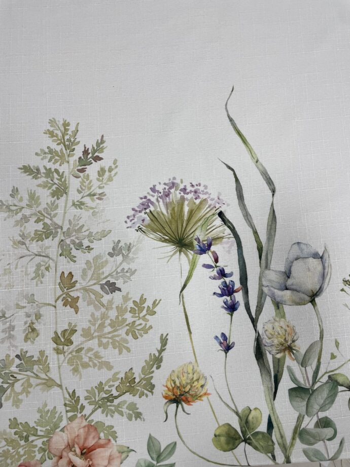 Il tessuto idrorepellente Achillea presenta una raffinata fantasia floreale che si estende su tutta la superficie, creando un effetto armonioso e uniforme.. Caratterizzato da una varietà di piante e fiori disegnati in toni tenui su uno sfondo bianco. Le sfumature di verde, viola e giallo richiamano la bellezza della natura, creando un’atmosfera fresca e luminosa.