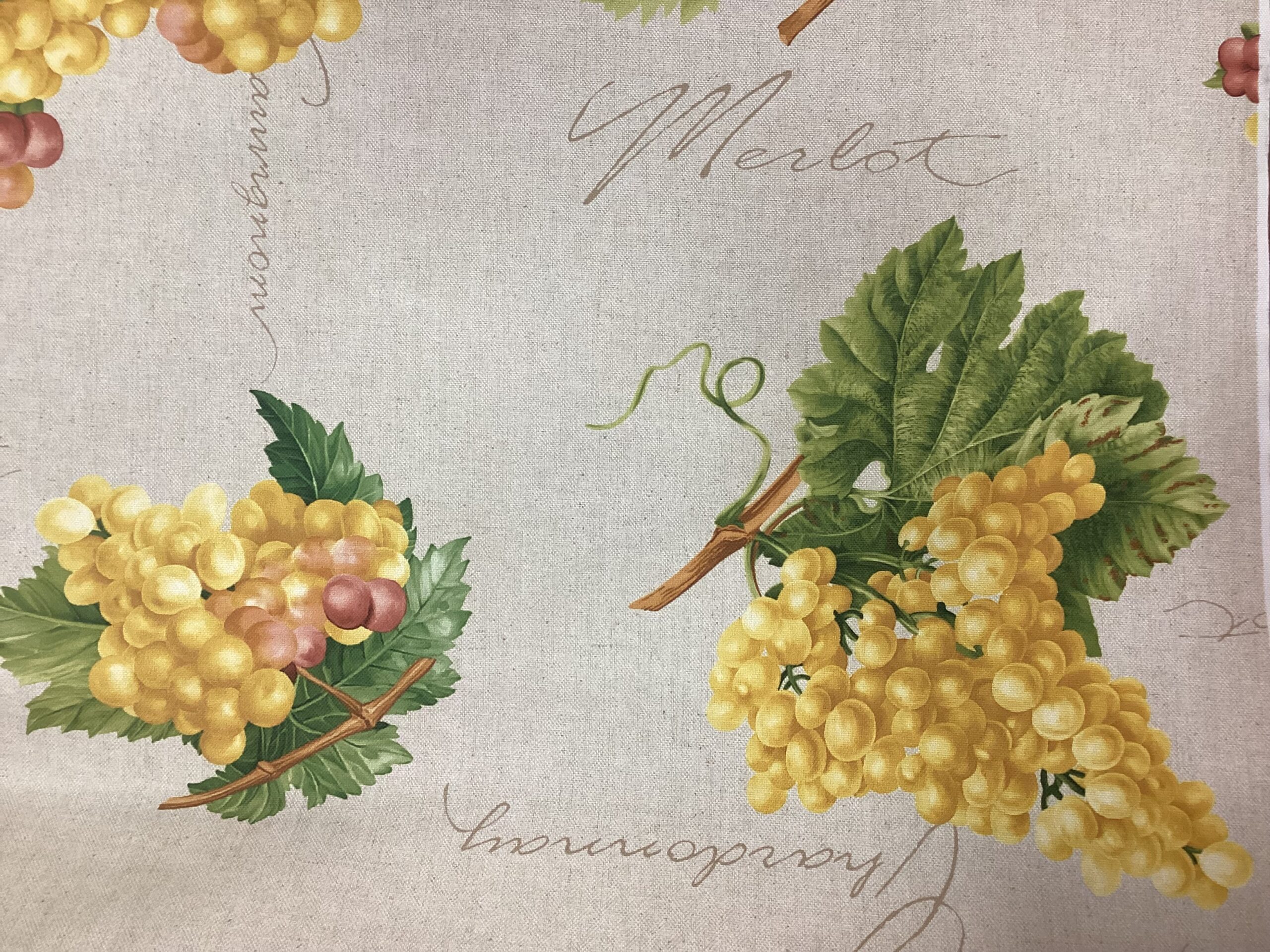 Meraviglioso tessuto tecnico in poliestere con stampa digitale di uva e con le scritte raffinate dei vini, altamente resistente alle macchie e allo stropicciamento.