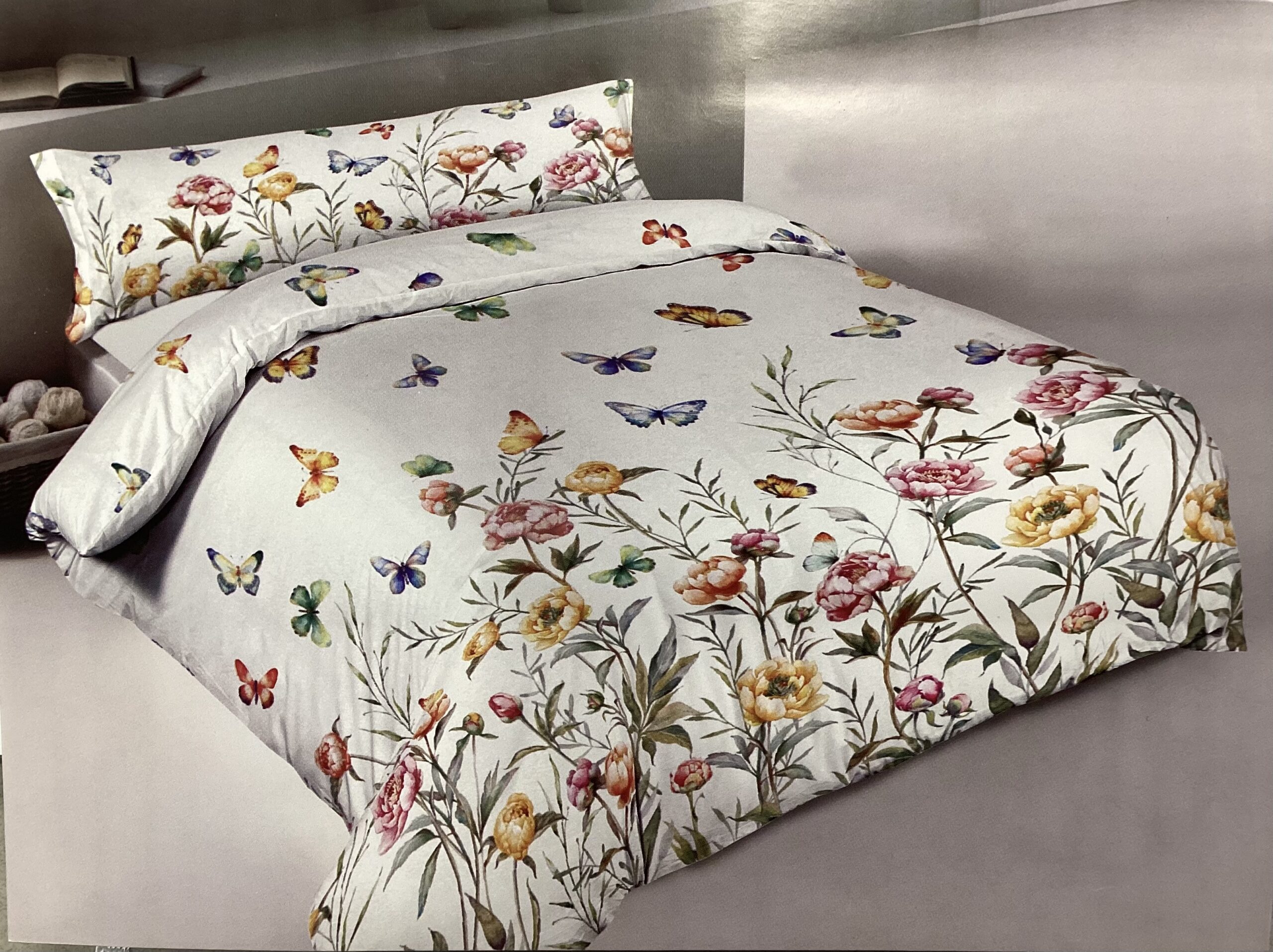 Parure letto effetto copriletto con stampa digitale di peonie e farfalle