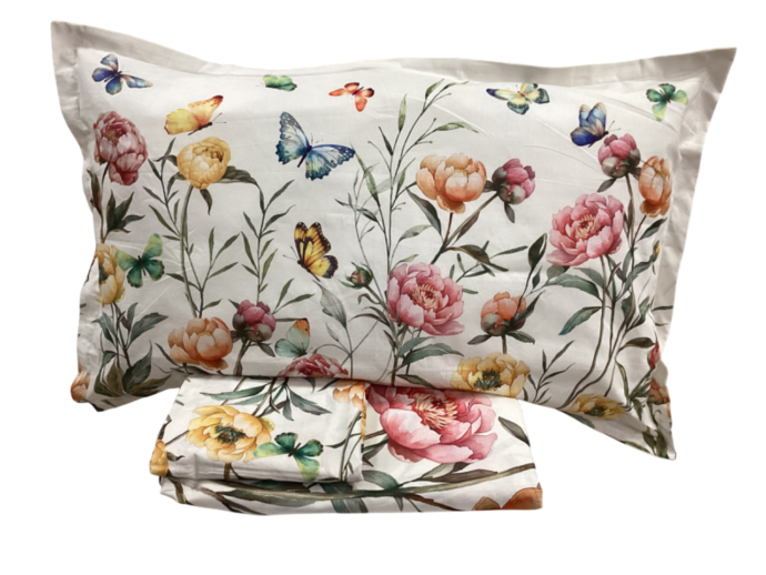 Il lenzuolo matrimoniale è realizzato in cotone offrendo una texture morbida e piacevole al tatto. La stampa digitale riproduce un’incantevole scena di peonie in fiore, abbinate a farfalle colorate che svolazzano tra i petali. I colori vivaci e i dettagli delicati creano un’atmosfera romantica e dinamica, portando un tocco di eleganza e freschezza alla stanza da letto. Perfetto per chi cerca un design floreale e vivace, senza compromettere la qualità del materiale.