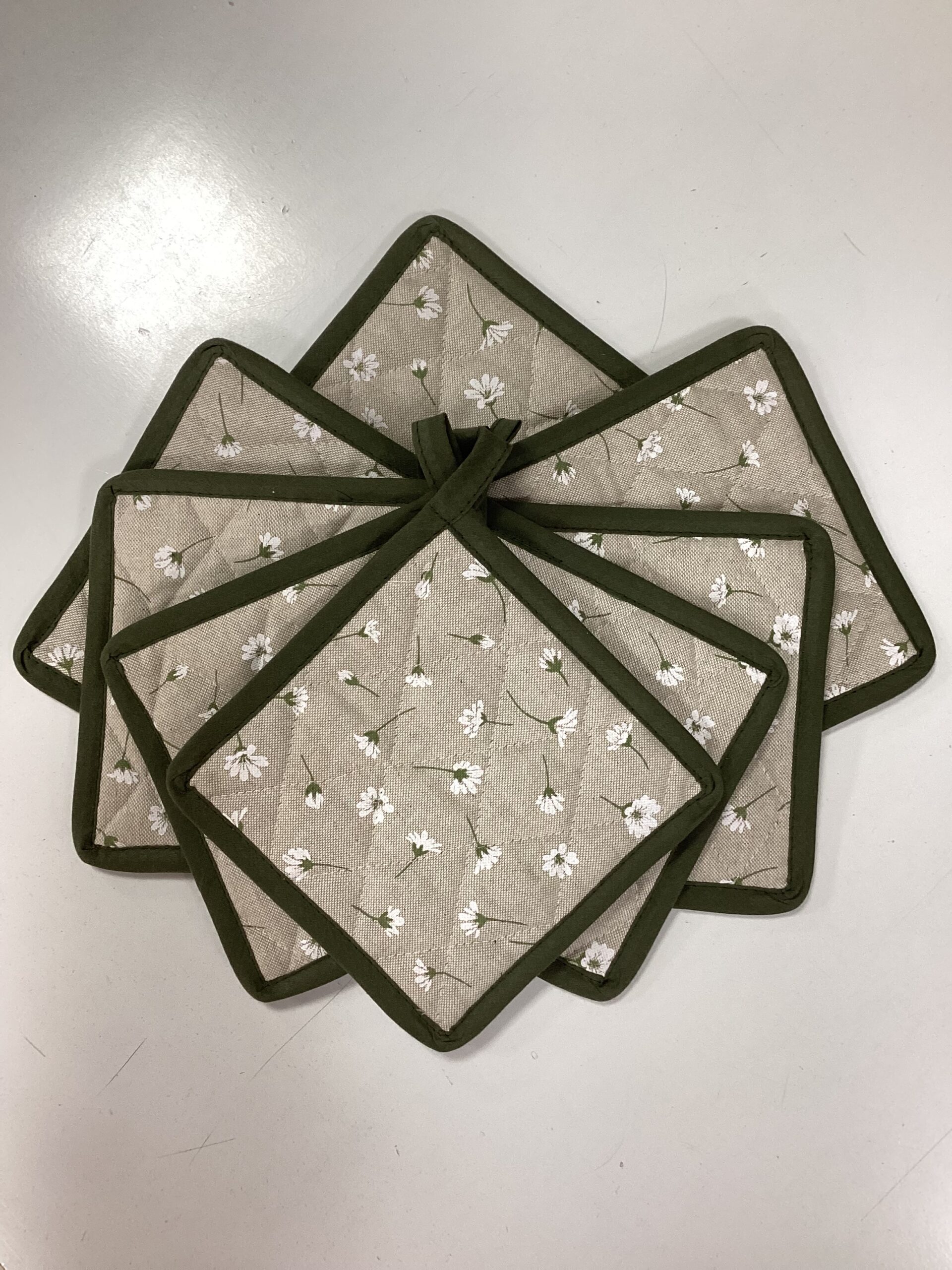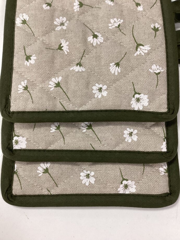 Immagina una presina con una base beige, morbida e neutra. Sulla superficie, ci sono delle margheritine bianche, dai petali delicati e ben definiti. I fiori sono disposti in modo casuale, creando un effetto fresco e naturale. Il design è semplice, ma elegante, perfetto per dare un tocco di freschezza e luminosità alla cucina.