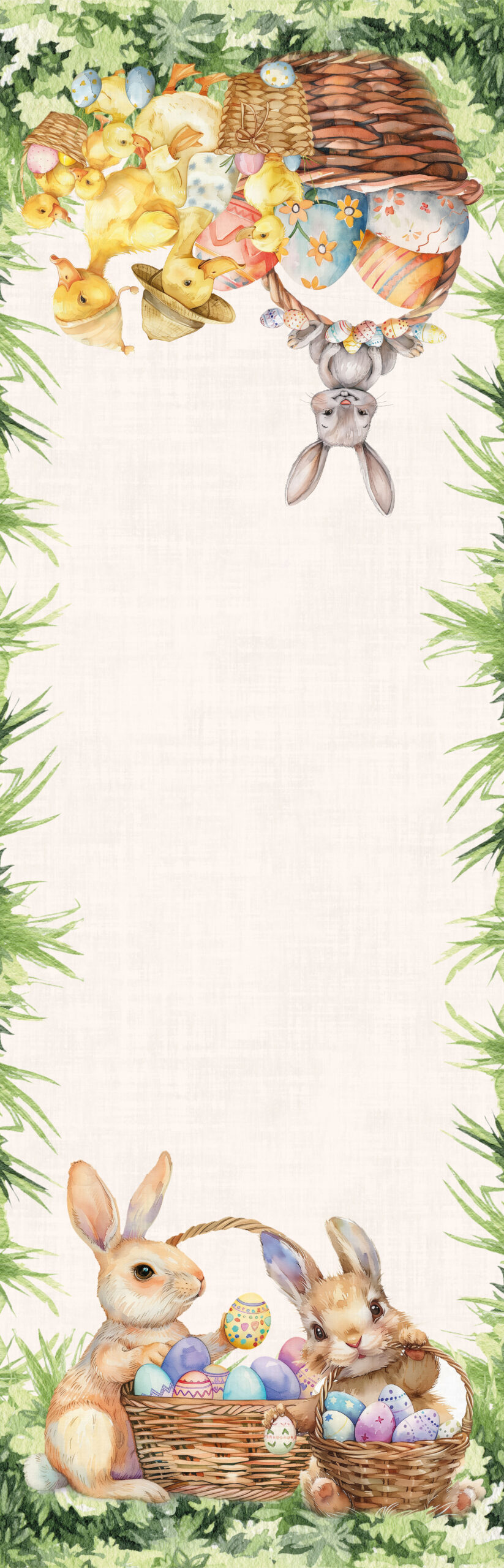 Il runner di cotone è decorato con un design festoso che celebra la Pasqua. Su uno sfondo chiaro, si alternano coniglietti simpatici, disegnati con tratti delicati, e uova pasquali colorate, impreziosite da motivi vivaci e fantasiosi. I toni pastello di rosa, giallo, verde e azzurro dominano la scena, creando un’atmosfera allegra e primaverile. È un complemento perfetto per aggiungere un tocco di stile e freschezza alla tavola durante le festività pasquali.