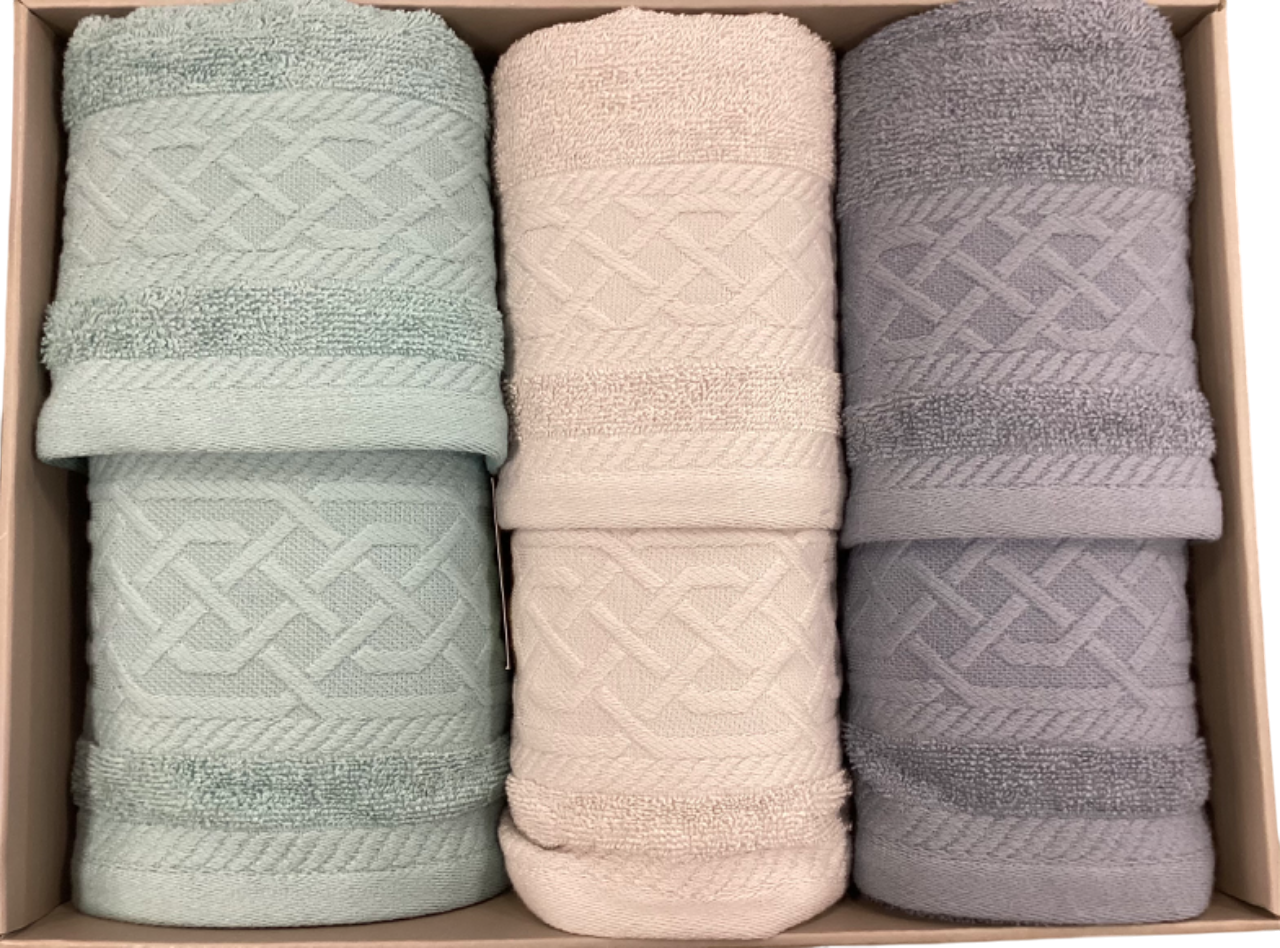 Set di 6 pezzi : 3 asciugamani viso (60×100 cm) e 3 asciugamani ospite (40×60 cm) di puro cotone, Made in Italy, disponibile in vari colori e confezionato in scatola