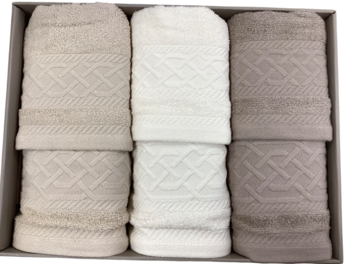 Questo set di asciugamani in puro cotone Made in Italy è un vero simbolo di eleganza e qualità. Composto da sei pezzi, ideali per un utilizzo quotidiano di alta qualità. Il set è disponibile nella tonalità del Tiffany/Perla/Carta da zucchero e Beige/Bianco/Tortora. Ogni set include due asciugamani per il viso (60×100 cm) e per l’ospite (40×60 cm). Sono confezionati in una scatola raffinata, perfetta anche come regalo.