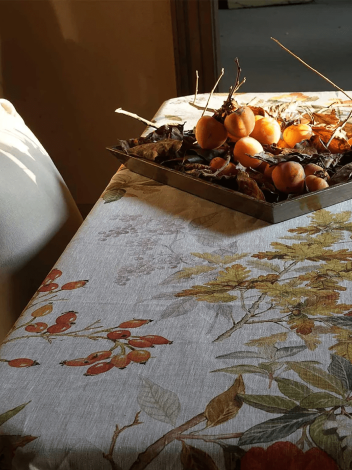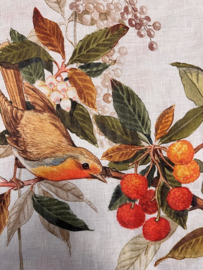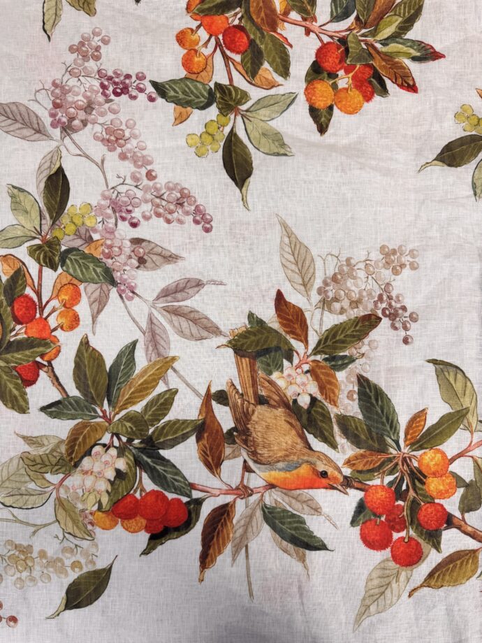 Il fondo del tessuto è di un colore neutro chiaro, che mette in risalto i colori caldi e autunnali del disegno. Le foglie sono dipinte in diverse tonalità di verde, marrone e dorato, mentre i frutti, in particolare quelli rossi, aggiungono un tocco di vivacità. Il dettaglio dell’uccellino, con le piume dai toni del marrone chiaro e un accenno di arancio sul petto, dona un senso di calma e armonia al design.
