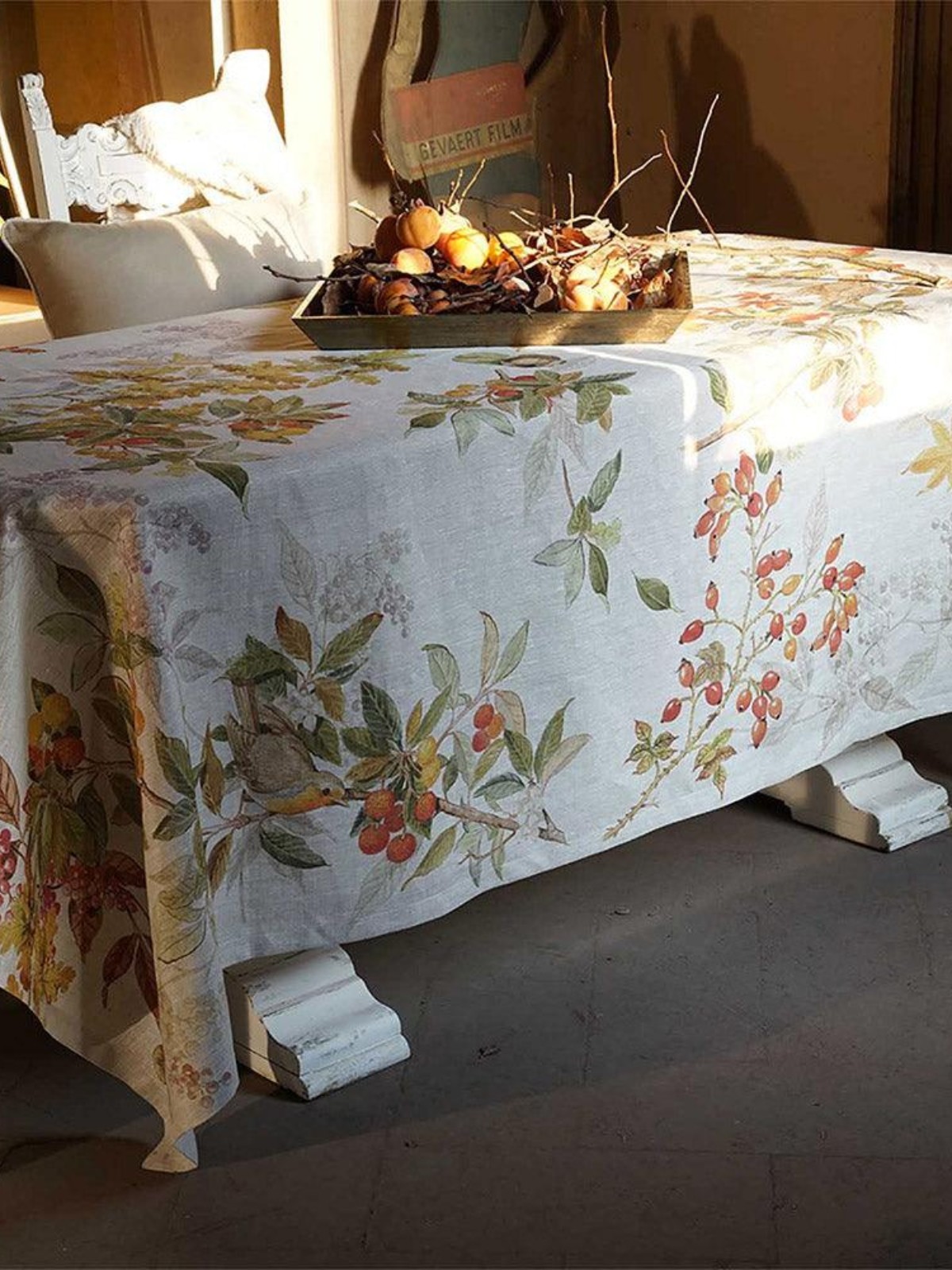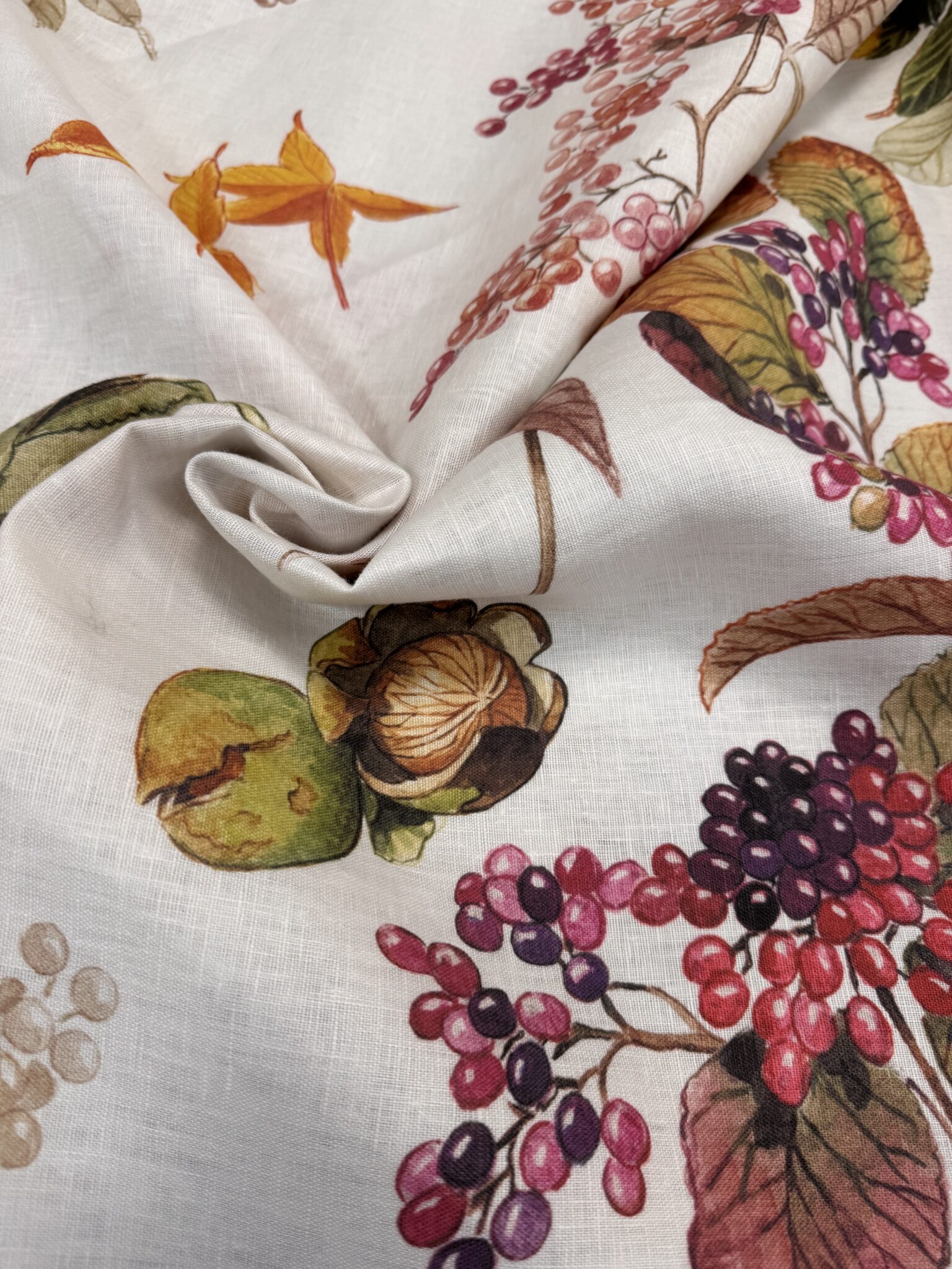 Tessuto in lino con motivi naturali di bacche ed un uccellino, dai toni delicati e rustici, perfetto per tovaglie.
