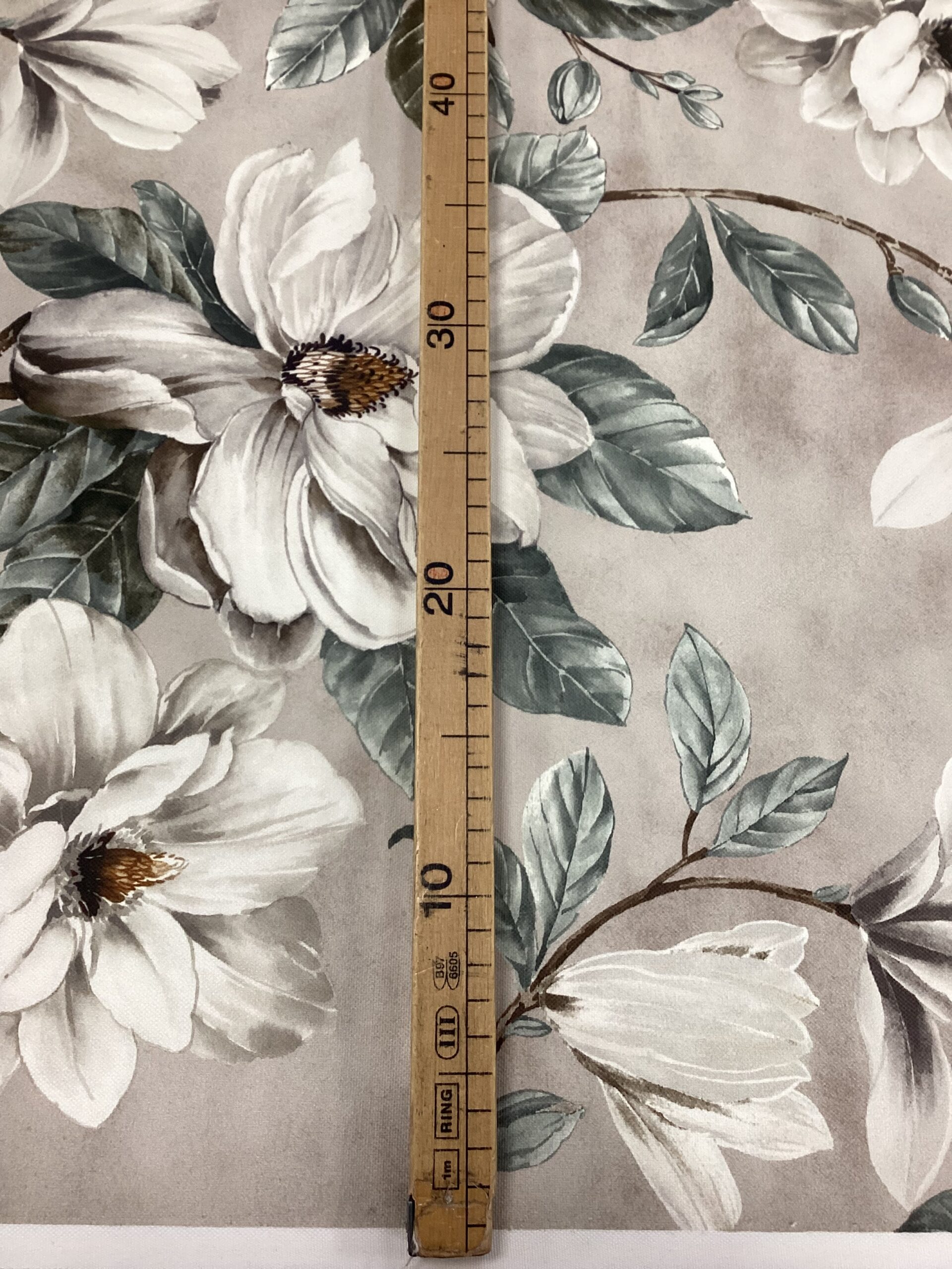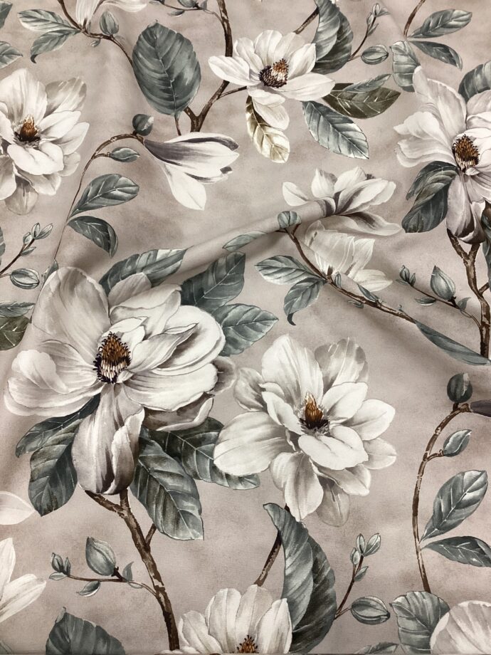 Tessuto antimacchia con stampa di fiori di magnolie, su fondo beige, senza necessità di stiratura, ideale per tovagliato e tappezzeria. Altezza tessuto cm. 1.60