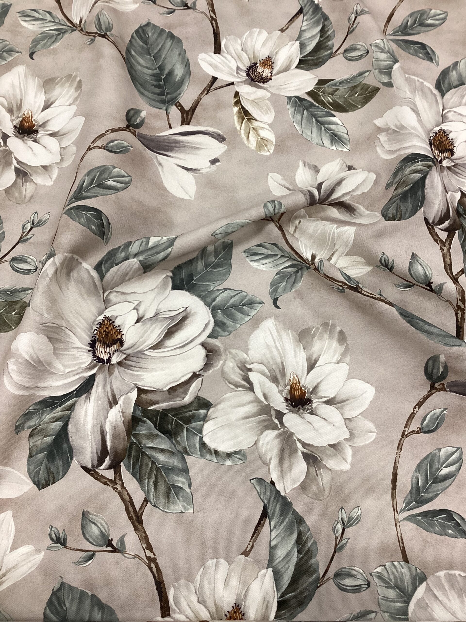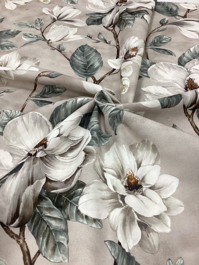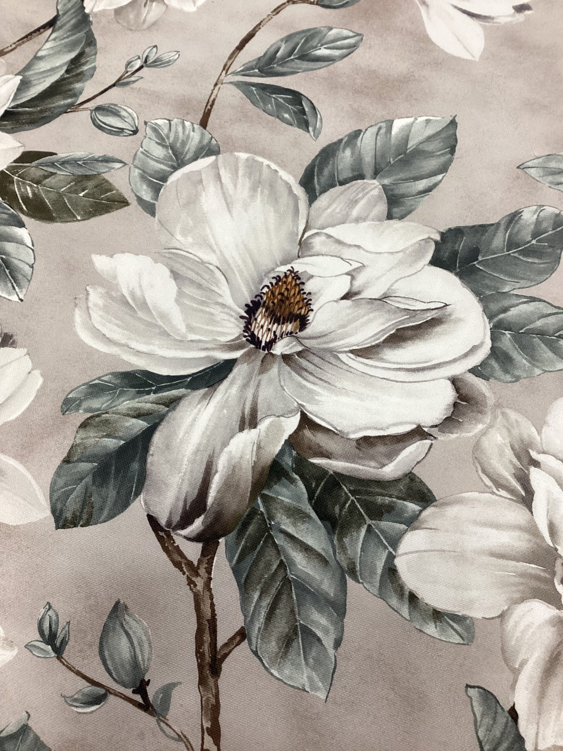 Si tratta di un tessuto pratico e decorativo, antimacchia e no stiro, perfetto per tovaglie e tappezzeria. La fantasia presenta eleganti fiori bianchi di magnolia accompagnati da foglie verdi, il tutto su un fondo beige neutro che dona calore e raffinatezza all’ambiente. La trama resistente e la finitura tecnica lo rendono facile da pulire e sempre in ordine, con un aspetto fresco e curato senza necessità di stiratura.