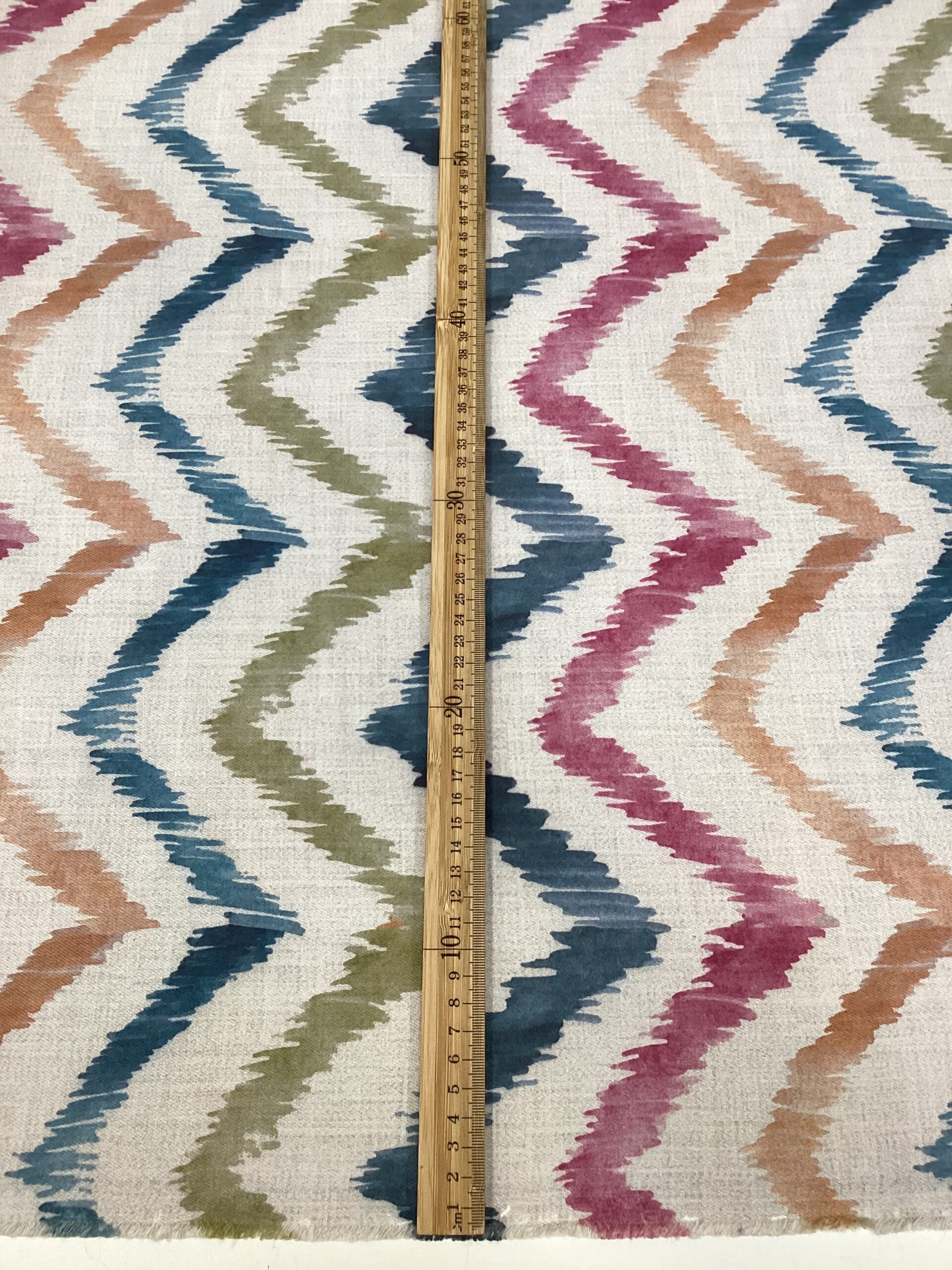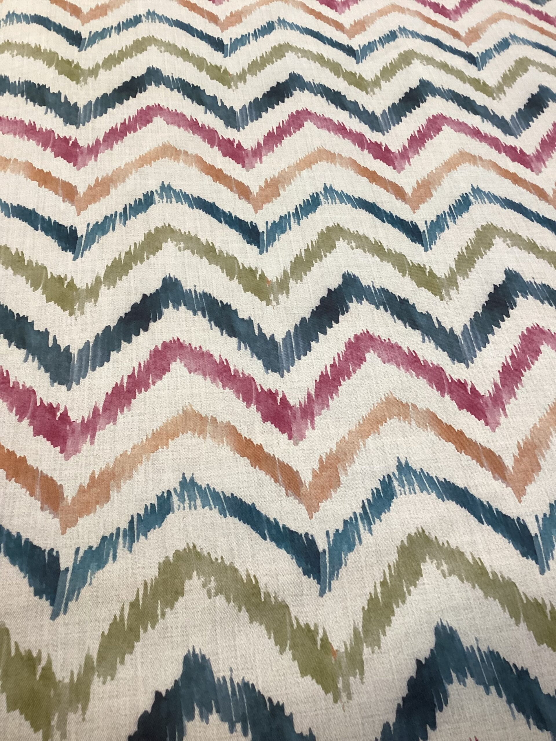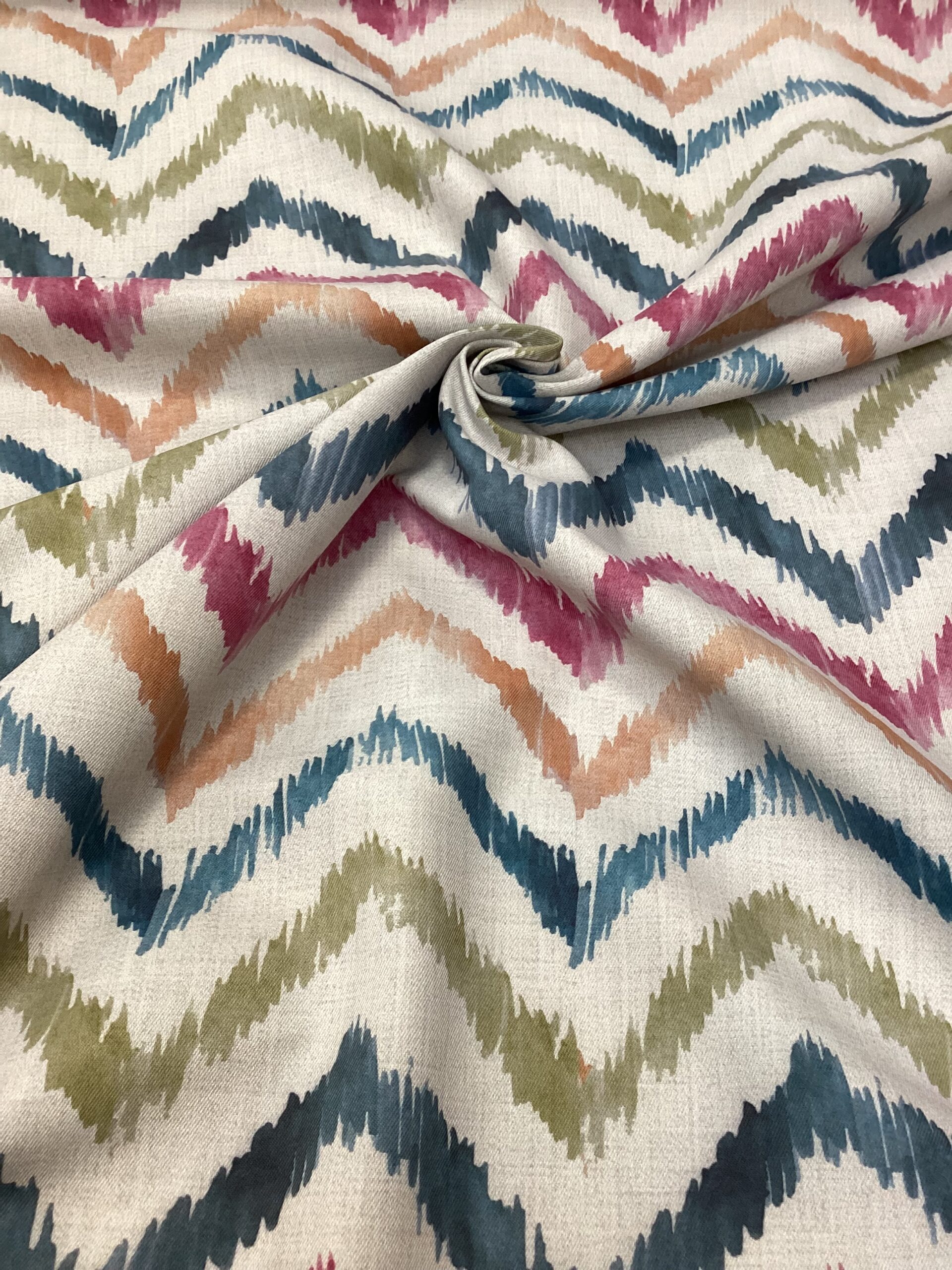 Dai carattere e stile ai tuoi ambienti con questo originale tessuto antimacchia, decorato con una vivace stampa digitale che riproduce un elegante motivo a spina di pesce dal percorso sinuoso e dinamico.