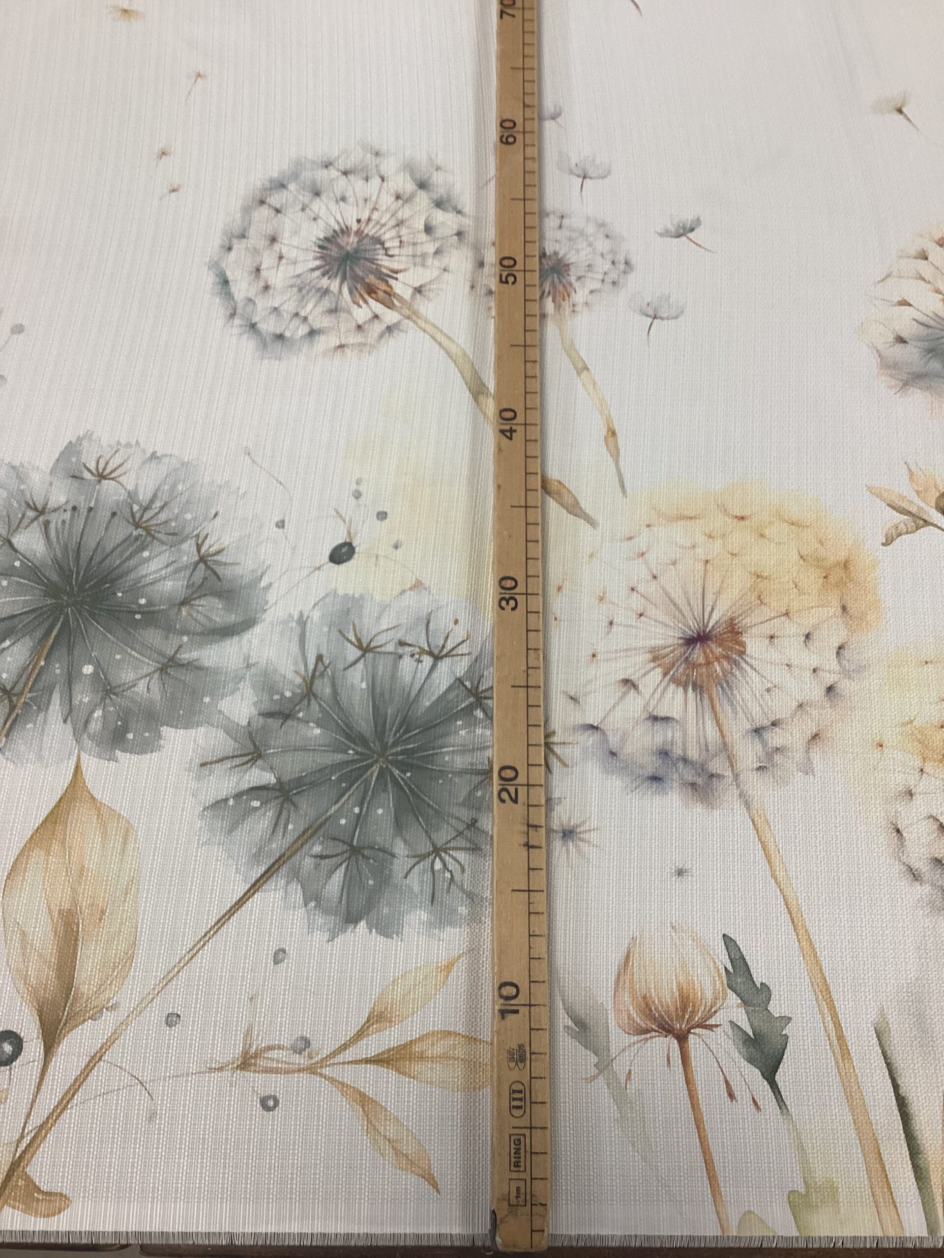 Tessuto antimacchia con stampa digitale del fiore Tarassacco in fiore. Altezza tessuto 1.60 m.