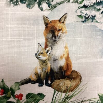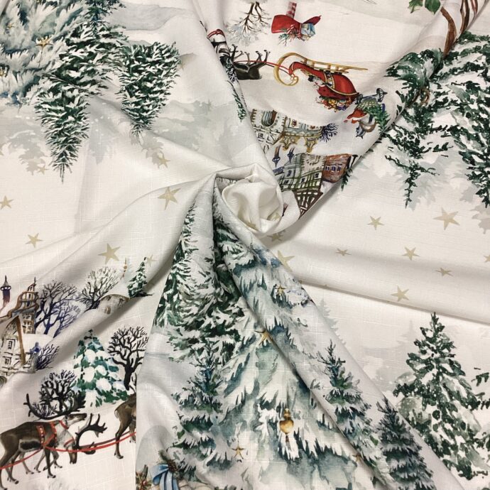 Questo tessuto di alta qualità è caratterizzato da una splendida stampa digitale che cattura un’incantevole scena invernale:
