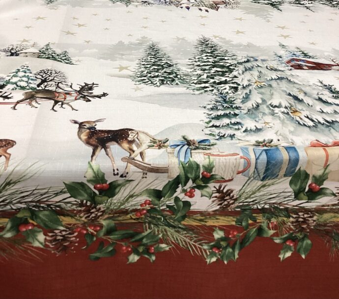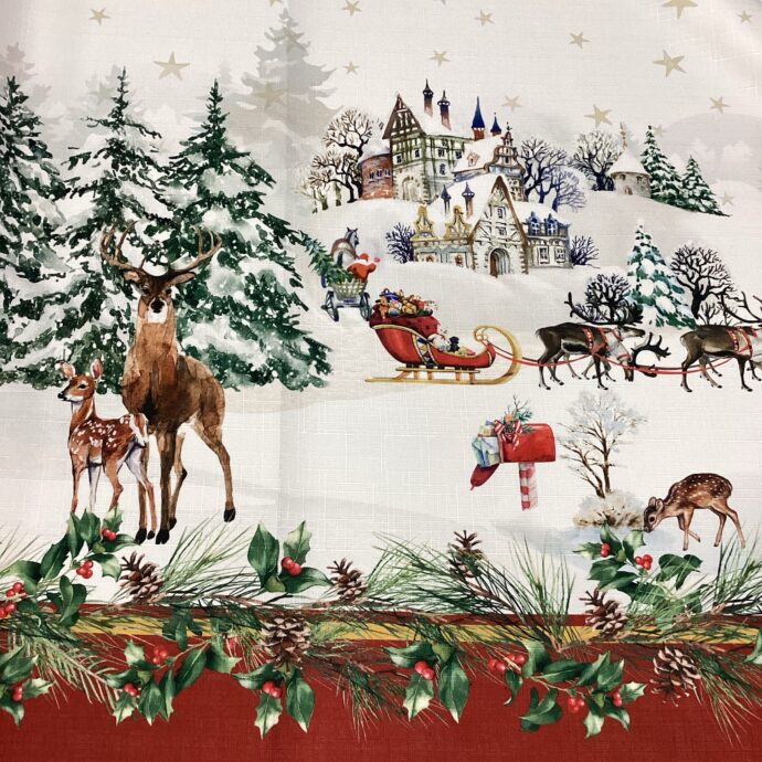Porta la magia e il calore delle feste nella tua casa con il nostro esclusivo Tessuto Antimacchia “Magia del Villaggio di Natale”.