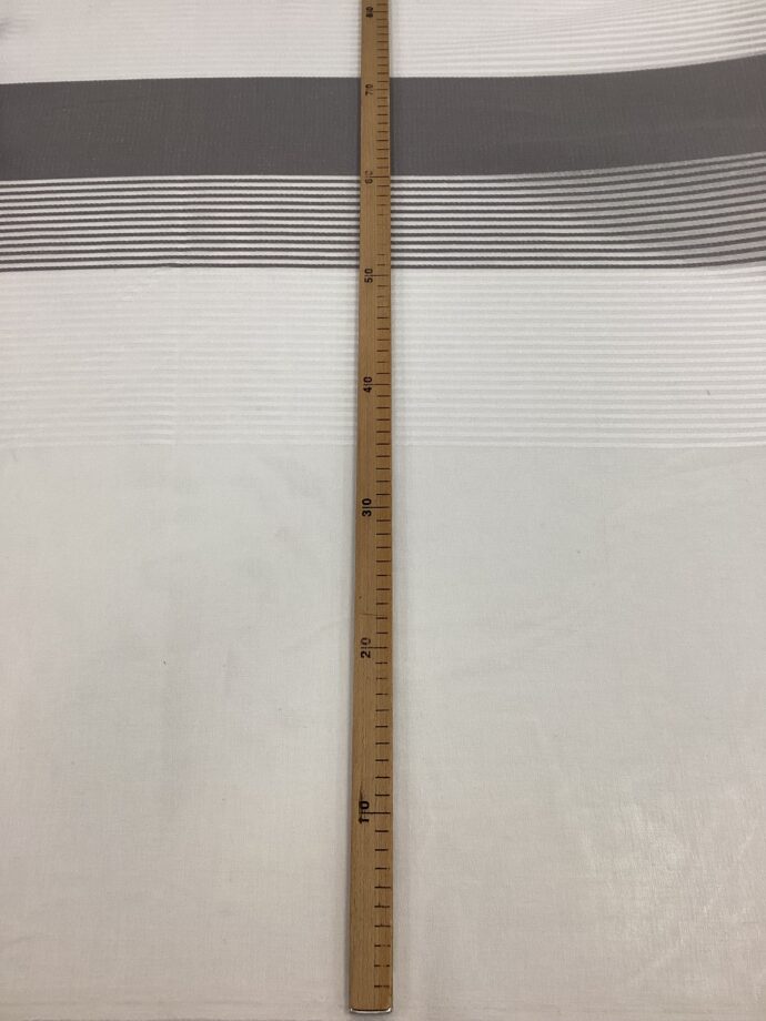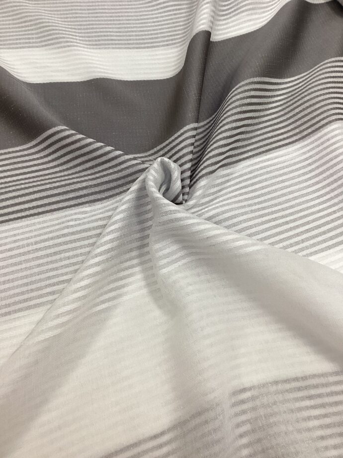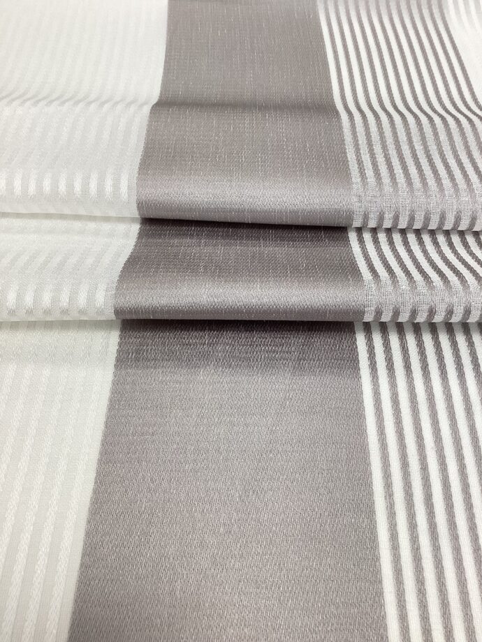 Il tessuto è composto da una sequenza regolare di fasce a tinta unita,grigia o beige, fasce bianche e una fascia centrale decorata da righe alternate al bianco, creando un effetto grafico raffinato ma non invadente. Questa combinazione dona movimento e profondità visiva pur mantenendo un’estetica pulita e contemporanea.
