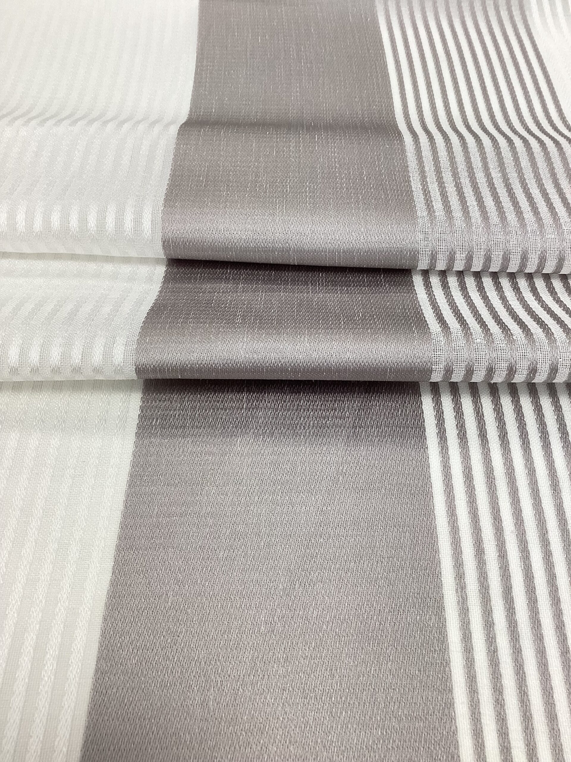 Tessuto ideale per tendaggi sia a onde sia a faldoni, con righe alternate, sono disponibili due varianti colori, grigio e beige, altezza tessuto 3 metri.