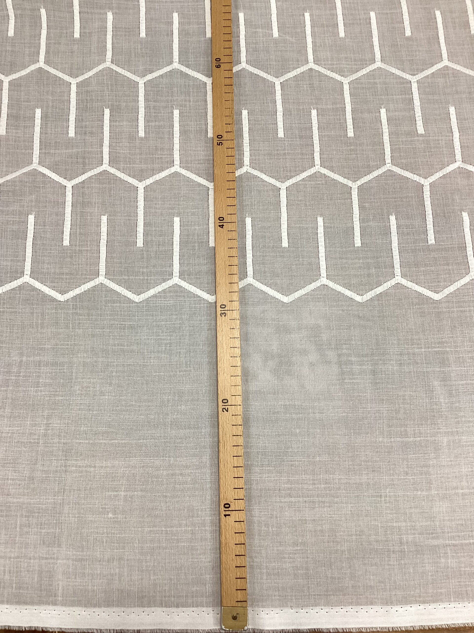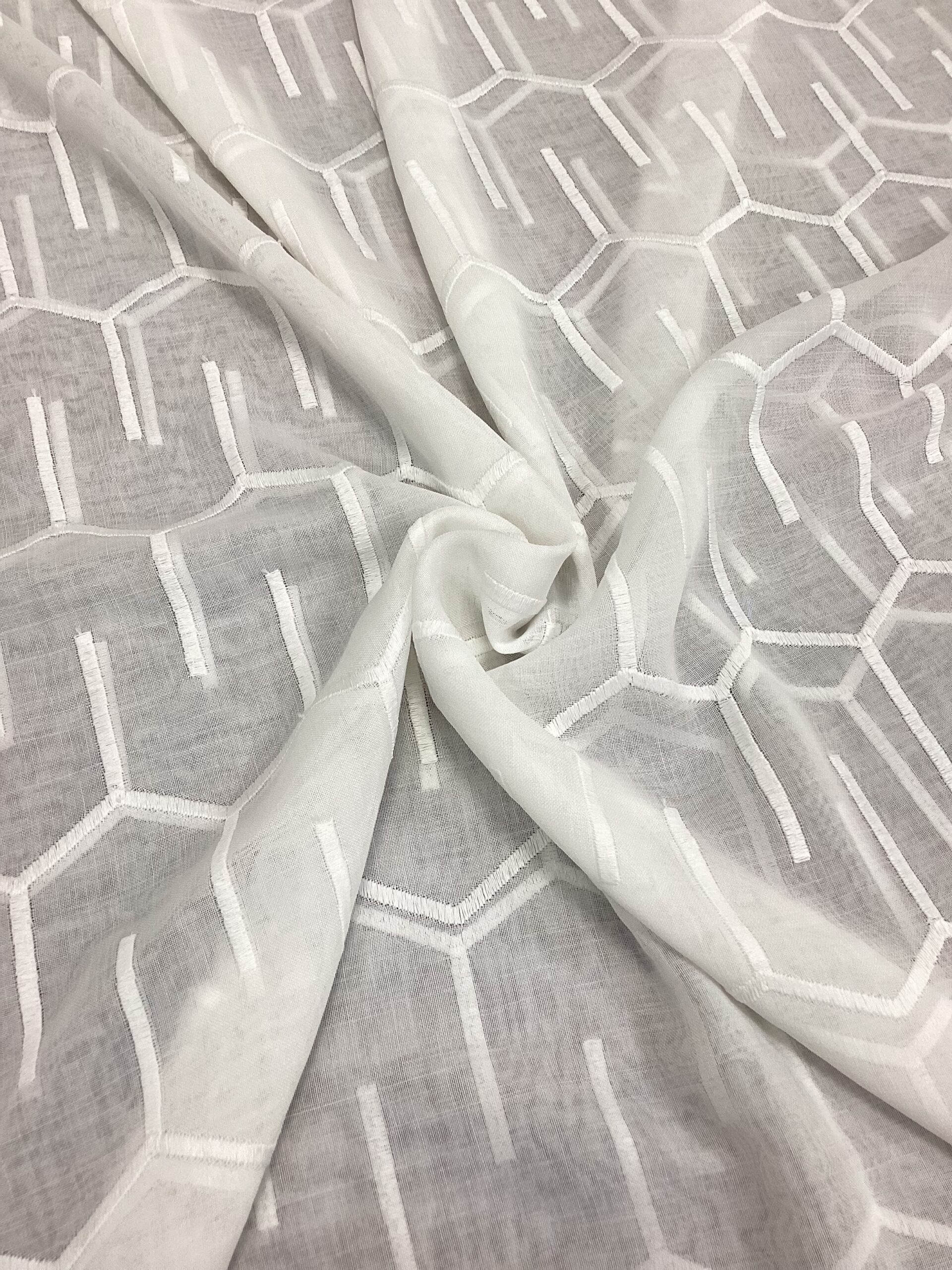Questo raffinato tessuto per tendaggi unisce design contemporaneo e versatilità sartoriale, adattandosi perfettamente sia a confezioni a onde morbide che a faldoni strutturati. Il protagonista è un ricamo a segmenti, che si sviluppa lungo la superficie in una sorta di serpentina geometrica, fatta di linee nette e definite, in un ritmo grafico sofisticato.