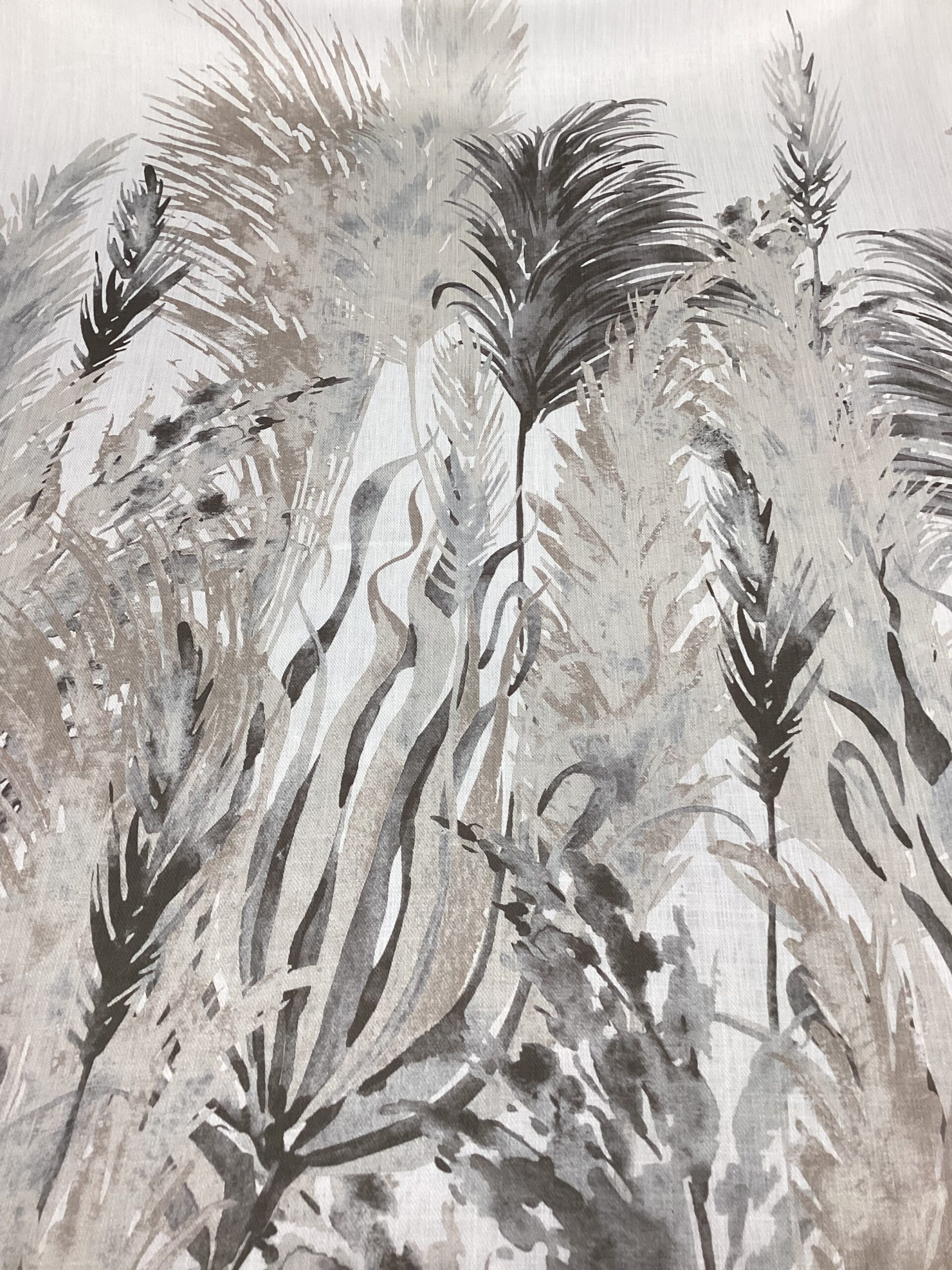 Tessuto decorativo 100% sintetico, ideale per realizzare tendaggi a onde e a faldoni, grazie alla sua perfetta caduta e leggerezza. La base bianca del tessuto esalta una raffinata stampa botanica che richiama la vegetazione tipica della savana: foglie sottili, steli slanciati e arbusti delicati si intrecciano in un disegno elegante e naturale.