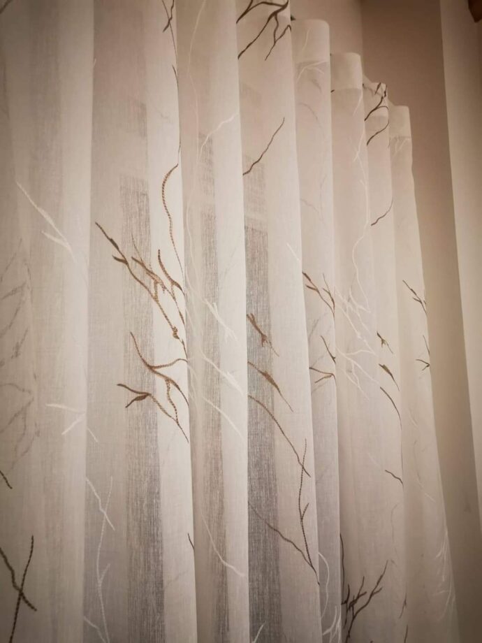 Il disegno regolare del ricamo aggiunge un tocco di ritmo visivo, mantenendo uno stile sobrio e sofisticato. Ideale per salotti, camere da letto o ambienti contract, questo tessuto valorizza la luce naturale e si adatta con eleganza a ogni contesto.
