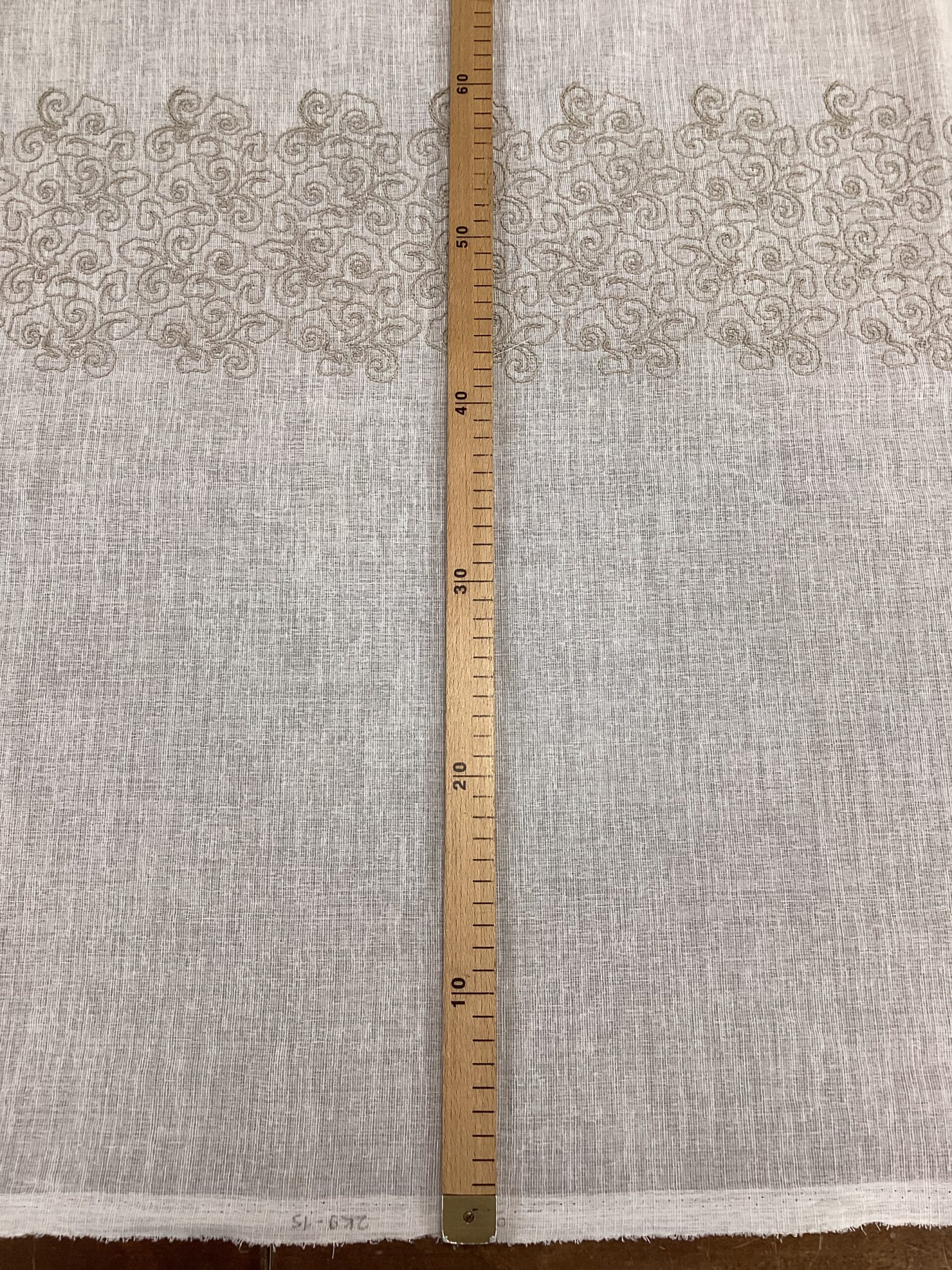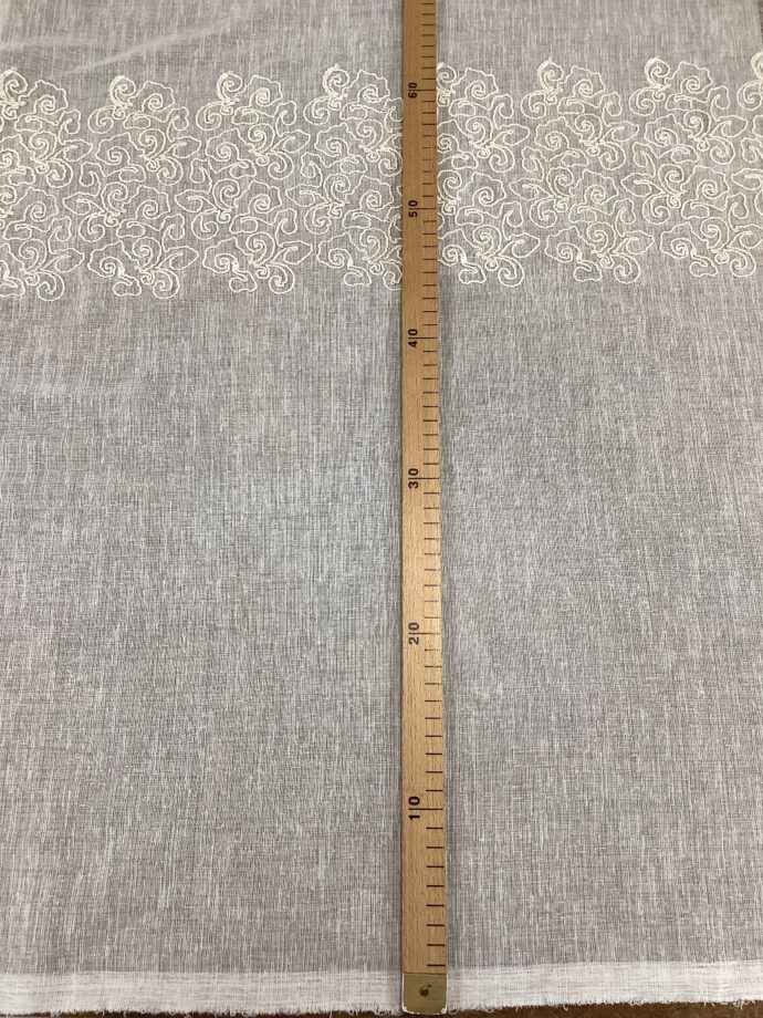 Grazie alla sua altezza di 3 metri, questo tessuto è ideale per ambienti residenziali e contract, dove si desidera coniugare funzionalità ed eleganza in modo armonioso. Ogni ricamo dista circa 40 cm l’uno dall’altro.