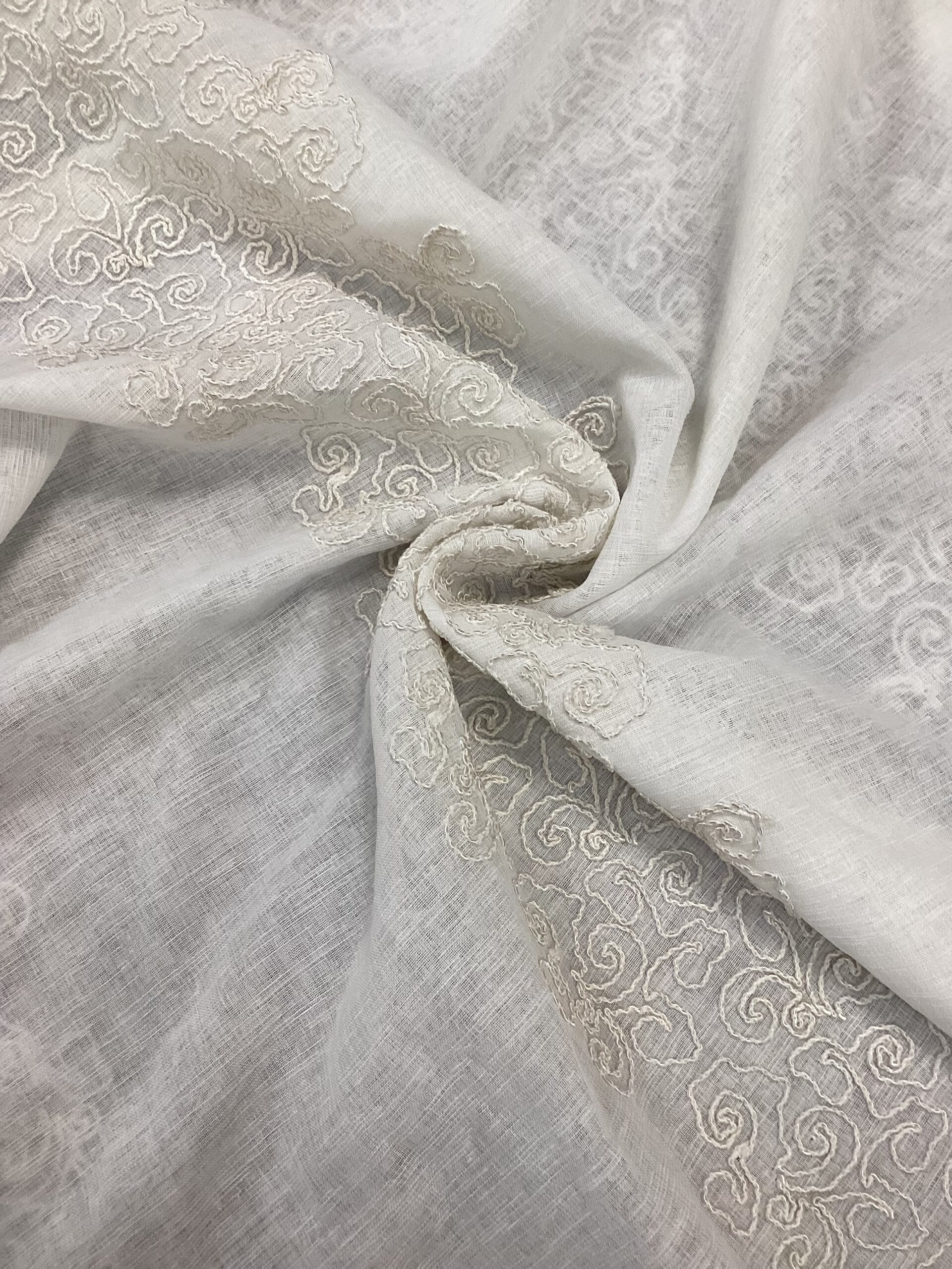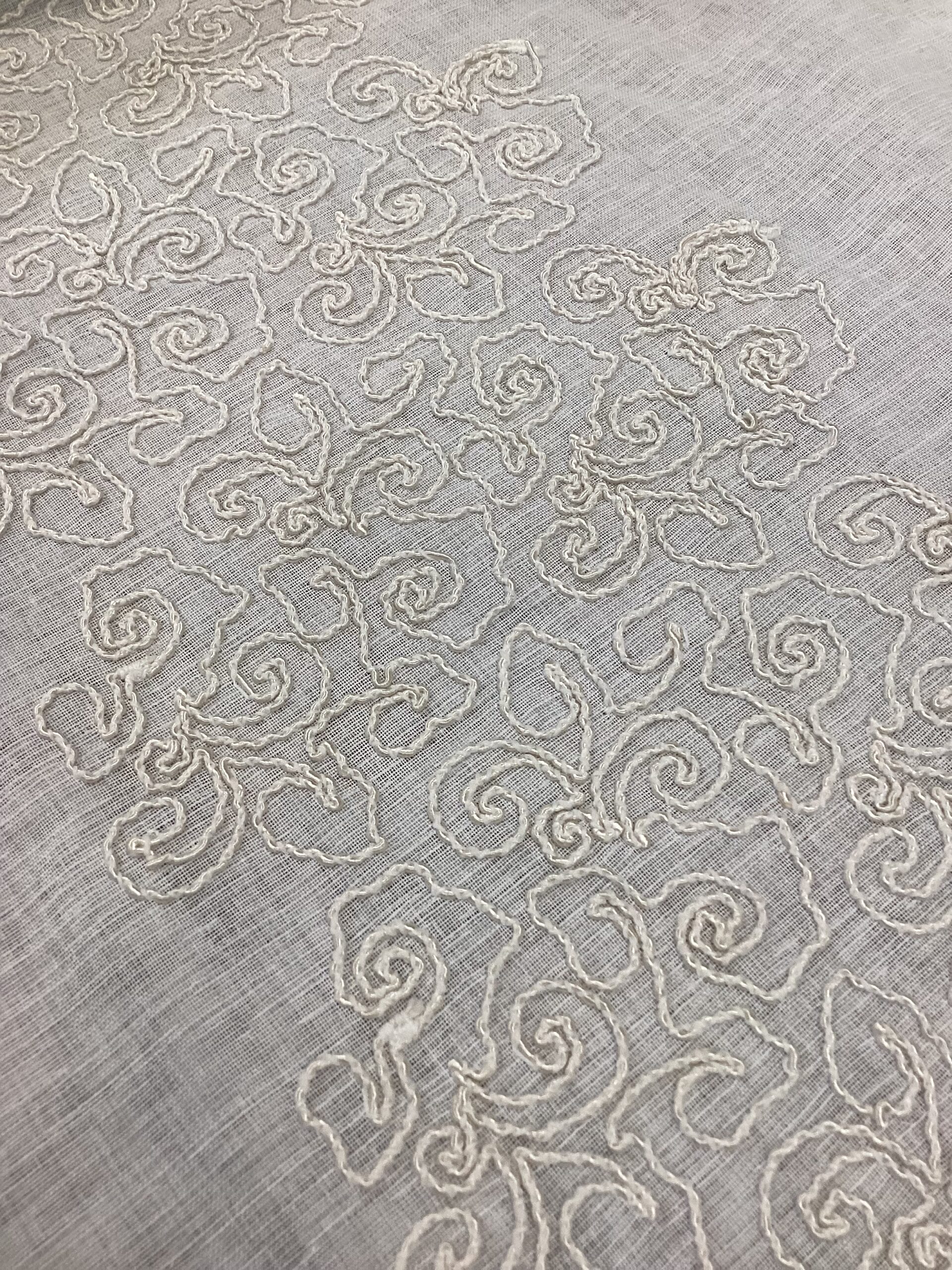Questo raffinato tessuto bianco con ricamo è la scelta perfetta per la realizzazione di tendaggi a onde morbide o a faldoni, grazie alla sua caduta fluida e alla texture leggera ma resistente. Realizzato in 100% poliestere, unisce estetica e praticità: è facile da manutenere, durevole e mantiene la sua bellezza nel tempo.