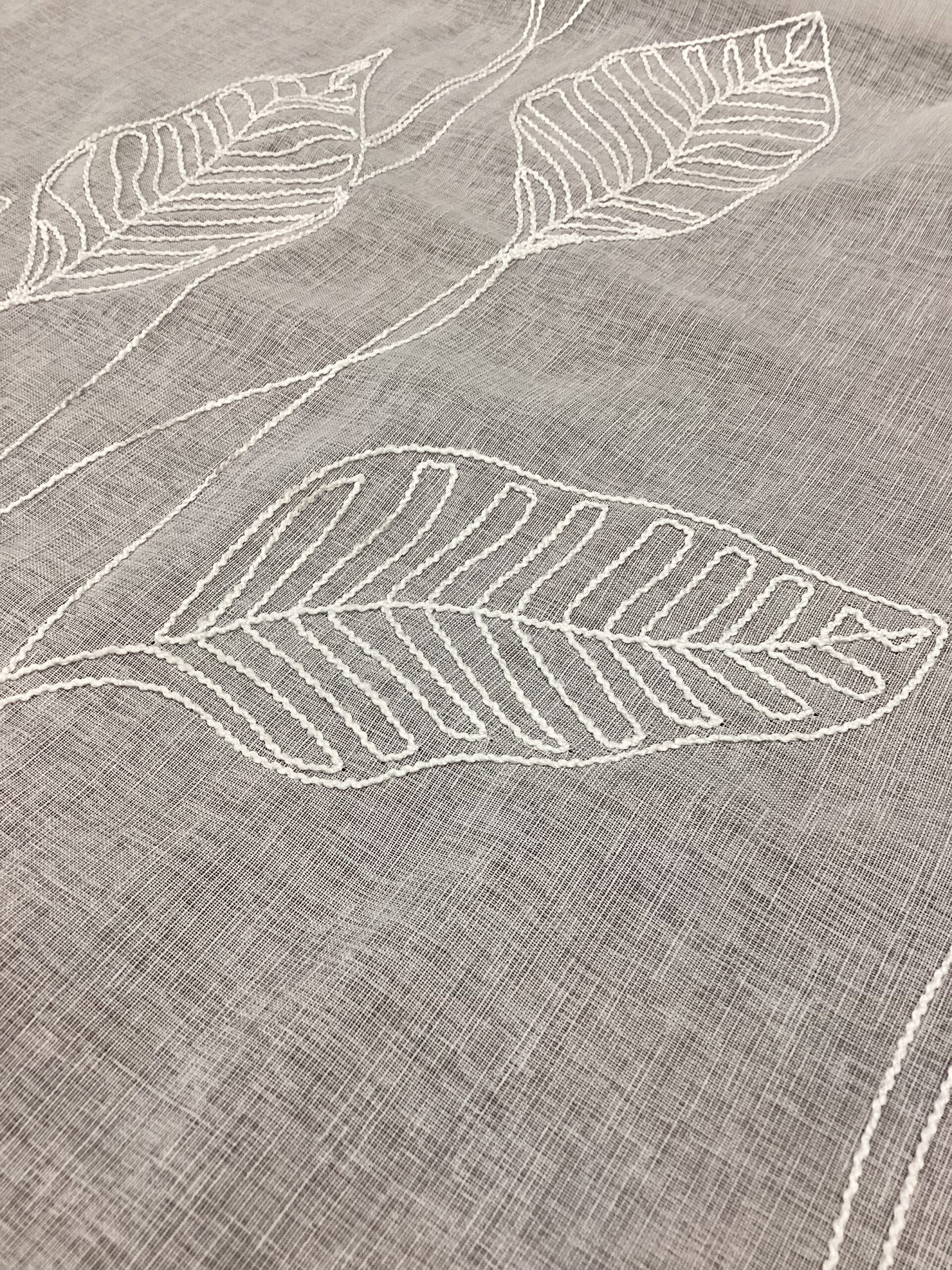 Il protagonista del design è un raffinato abbassamento di foglie in stile jungle, ricamato con cura a 1,20 metri dal piombino, creando un effetto scenografico che arricchisce la parte bassa del tendaggio senza appesantire l’insieme.