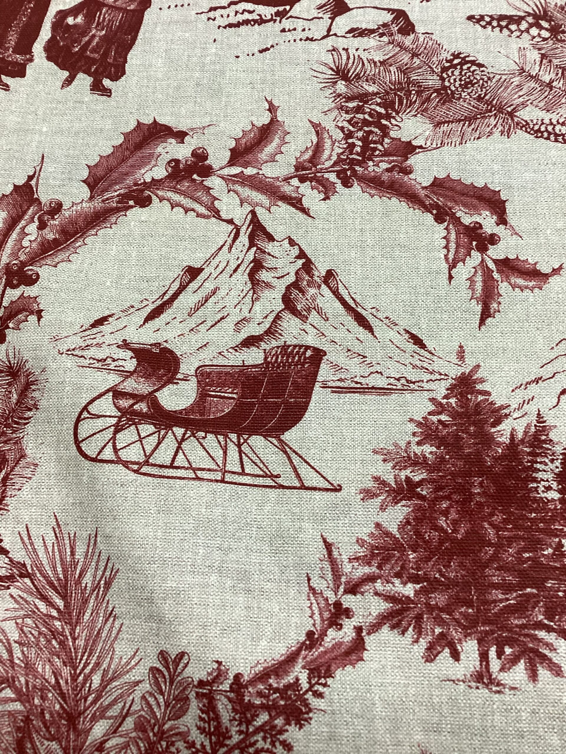 Questa stampa ricrea il celebre stile Toile de Jouy (tipicamente un motivo monocromatico su sfondo neutro), riproponendo scene e elementi tipici del Natale: