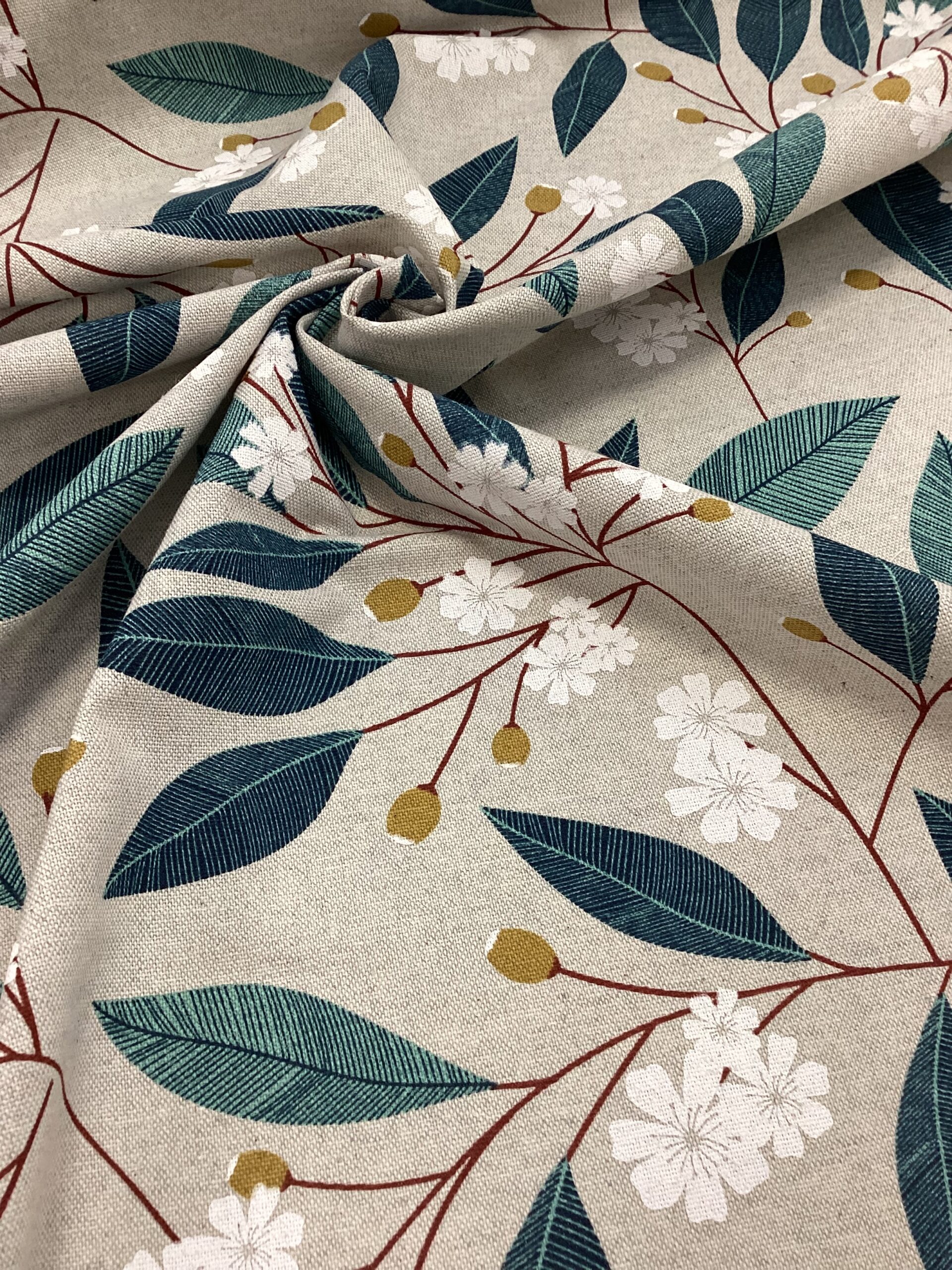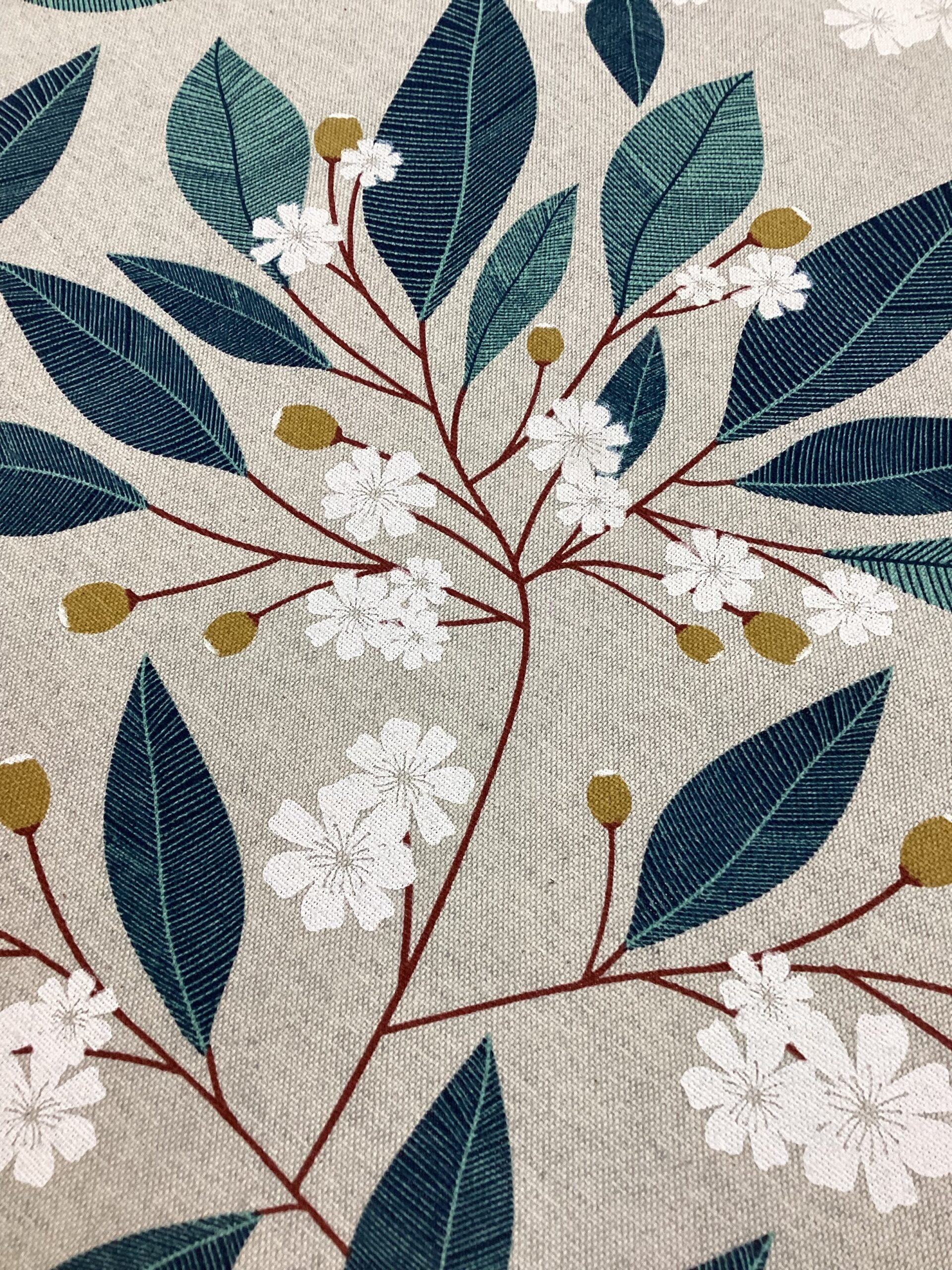 Il tessuto di cotone, perfetto per tovaglie e arredo casa, presenta un delicato motivo di fiori di ciliegio in fiore, di colore bianco, con steli rossi e germogli. La base beige conferisce eleganza e calore, creando un contrasto armonioso e naturale. Ideale per aggiungere un tocco di freschezza e raffinatezza agli spazi, questo tessuto porta un’atmosfera primaverile e accogliente in ogni ambiente.