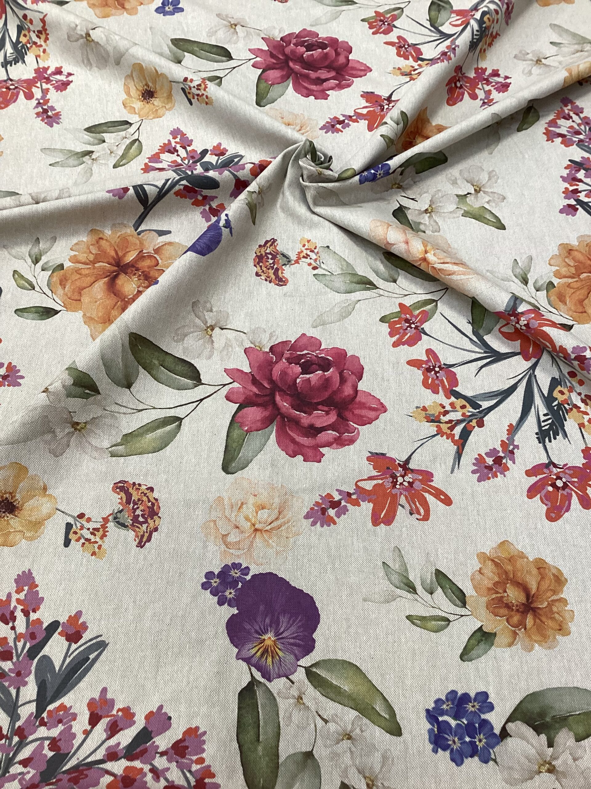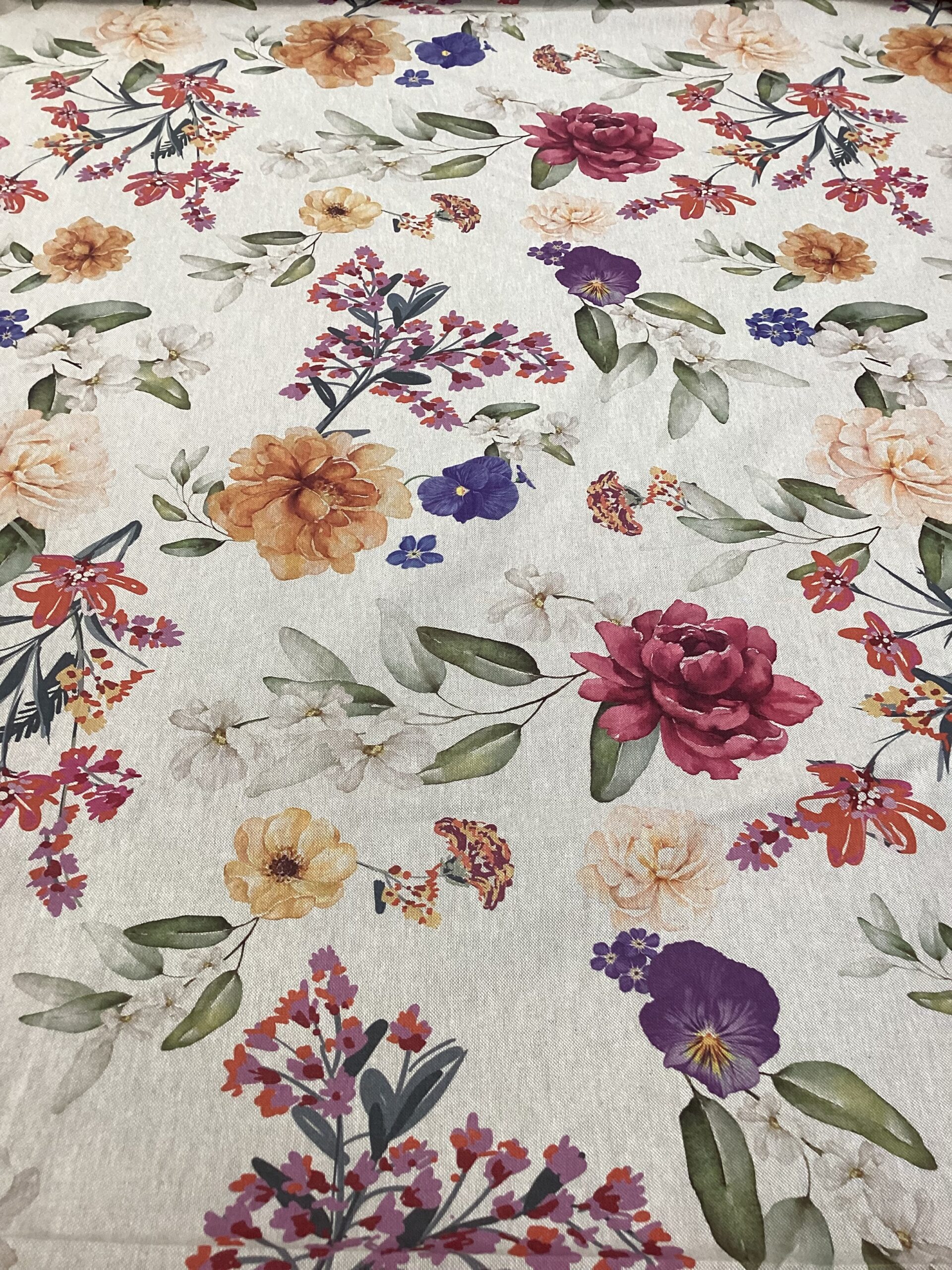 Tessuto in lino e cotone con stampa digitale tema fiori: rose, glicine e fiori. Altezza tessuto 2.80 m.