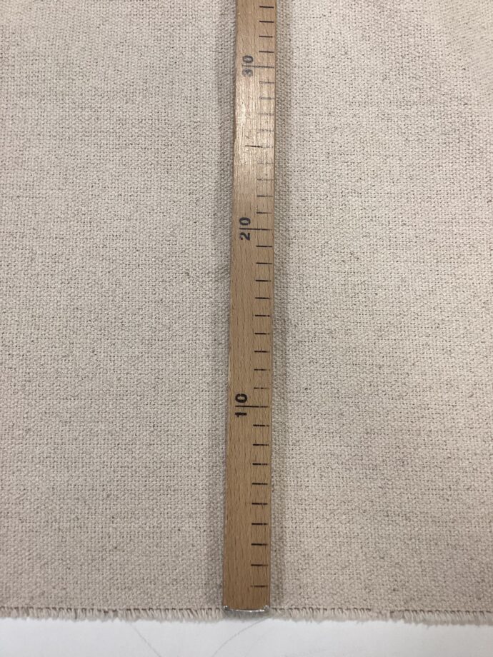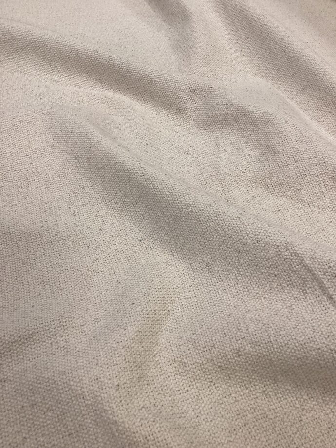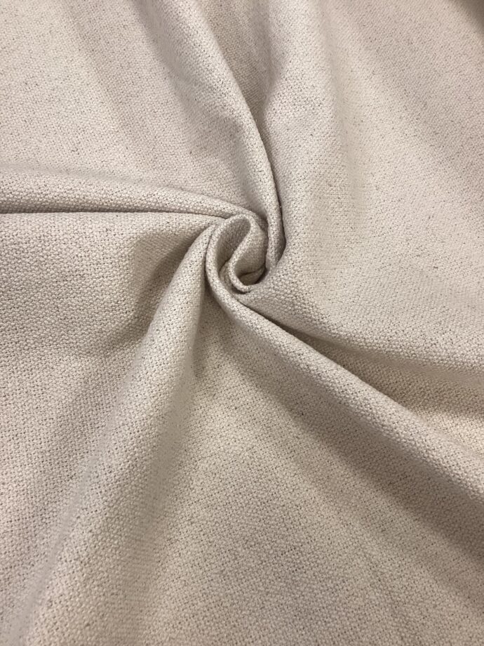 Il tessuto è un cotone grezzo a trama fitta, estremamente resistente e perfetto per impieghi in tappezzeria grazie alla sua robustezza e durabilità. La superficie ha un aspetto naturale e leggermente ruvido, tipico del cotone non trattato, con una mano corposa ma comunque morbida al tatto dopo qualche uso o lavaggio.