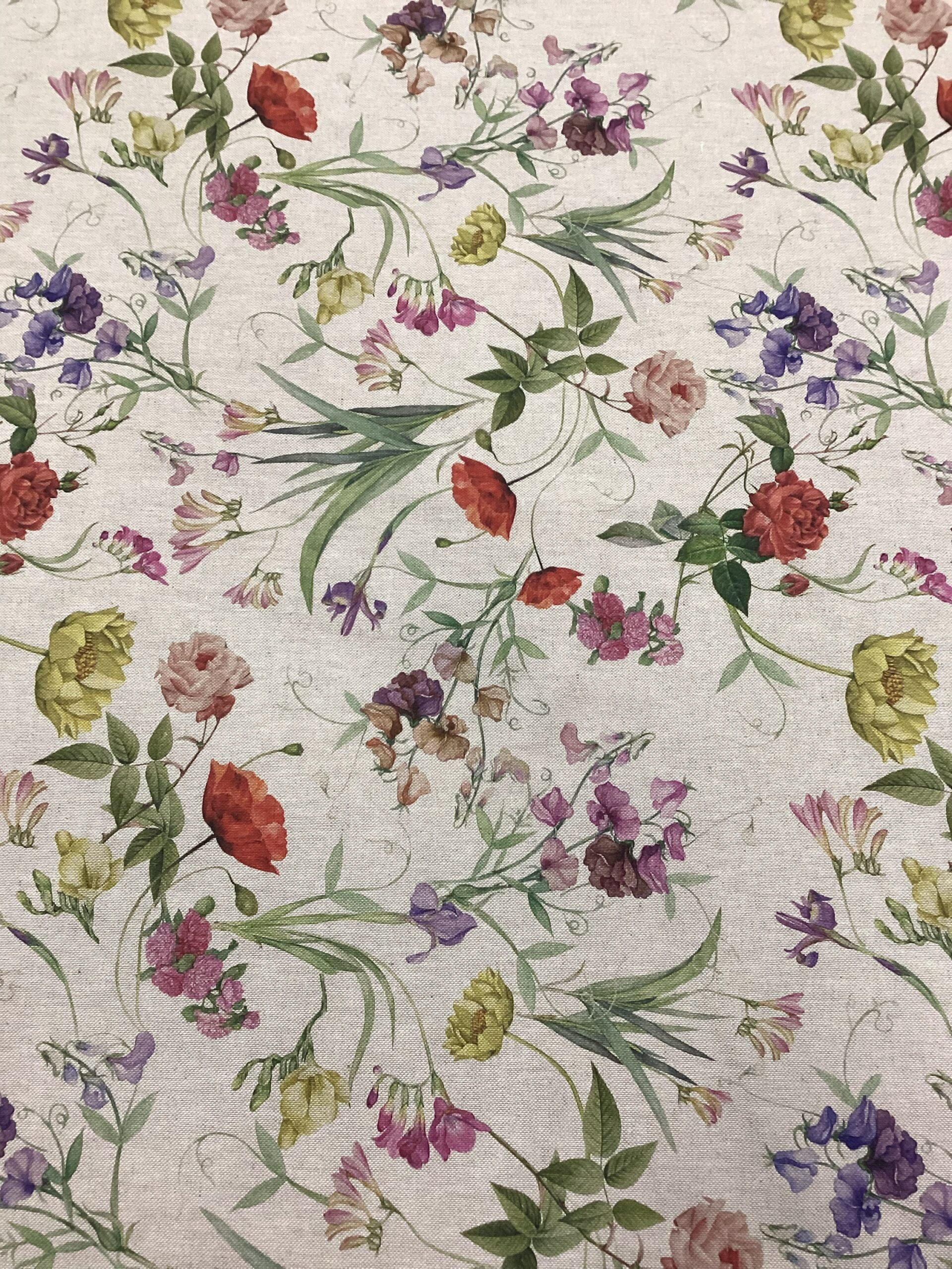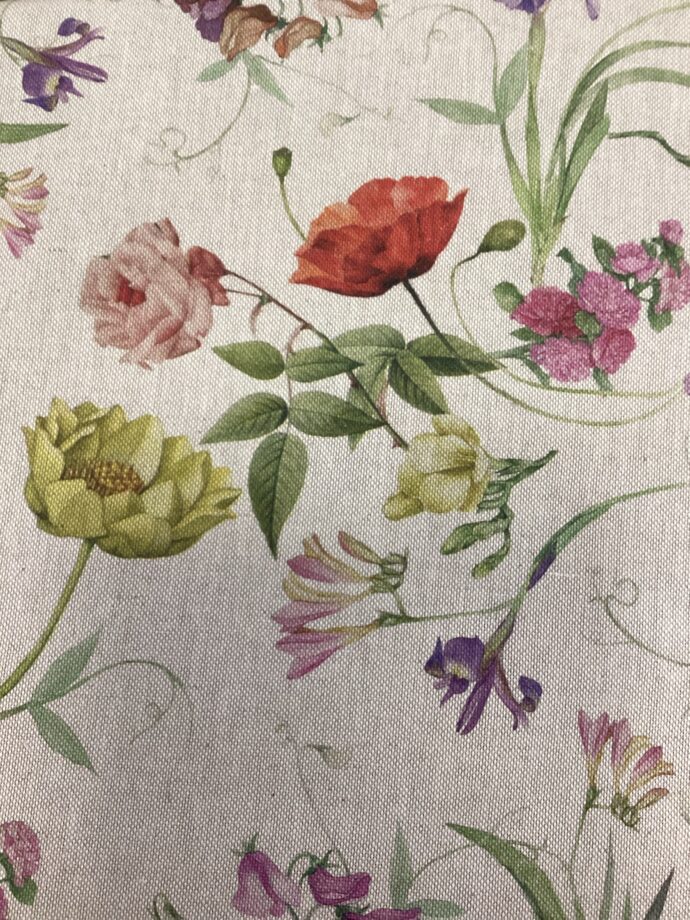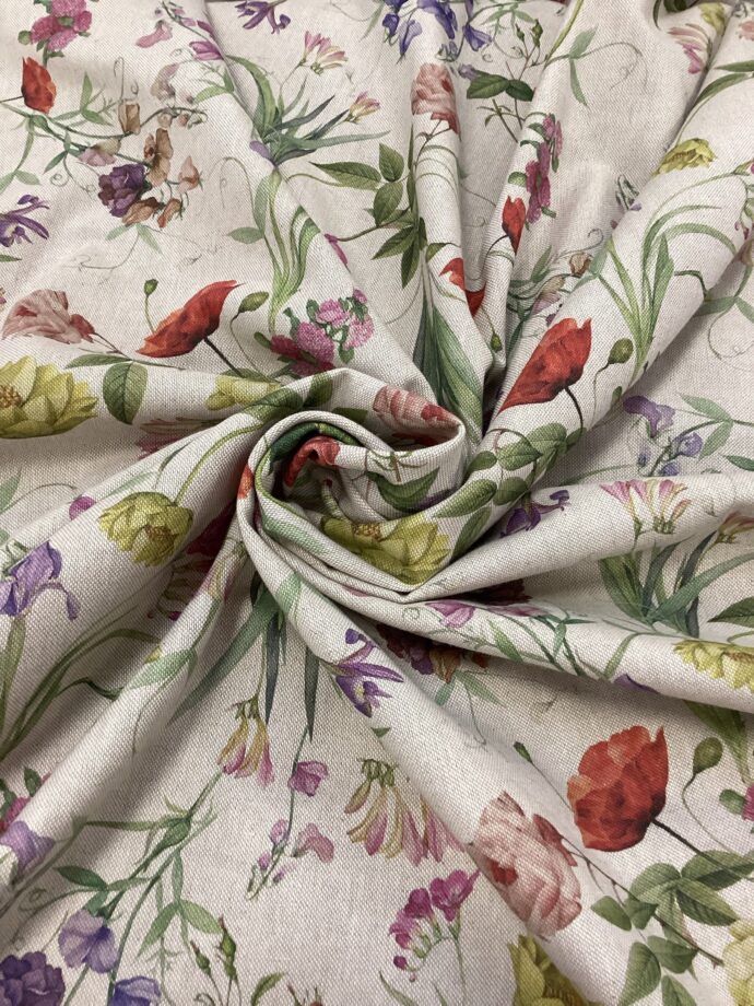Tessuto in misto cotone caratterizzato da stampa con motivi di fiori di campo ,tra cui spiccano rose e papaveri su fondo beige.