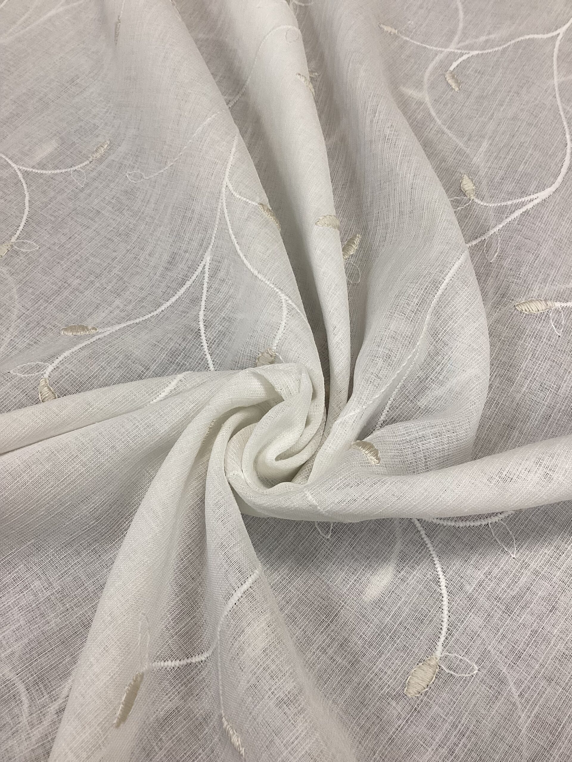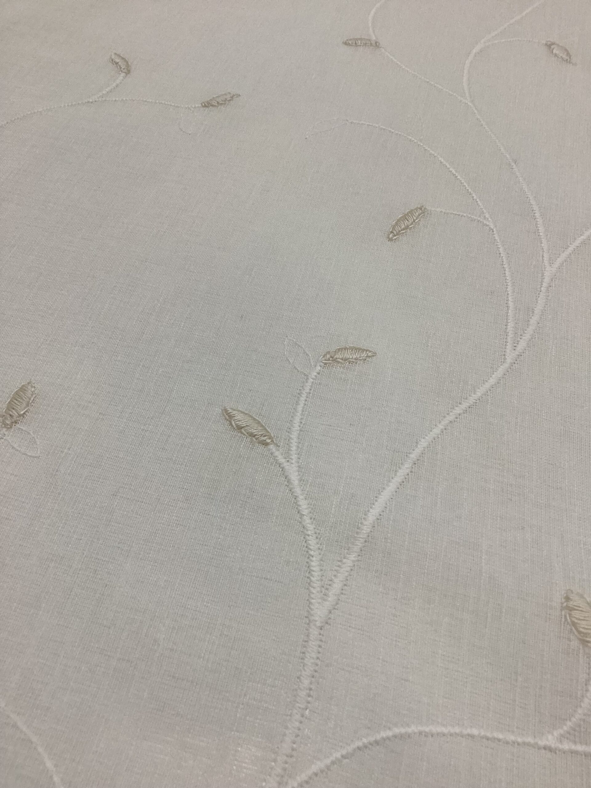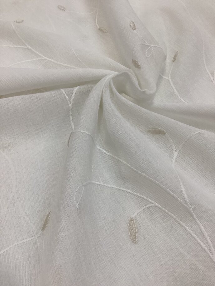Il ricamo, realizzato con tecnica precisa e dettagliata, crea motivi fogliari leggermente in rilievo, che donano profondità e dinamismo al tessuto, evocando la leggerezza della natura con uno stile contemporaneo.