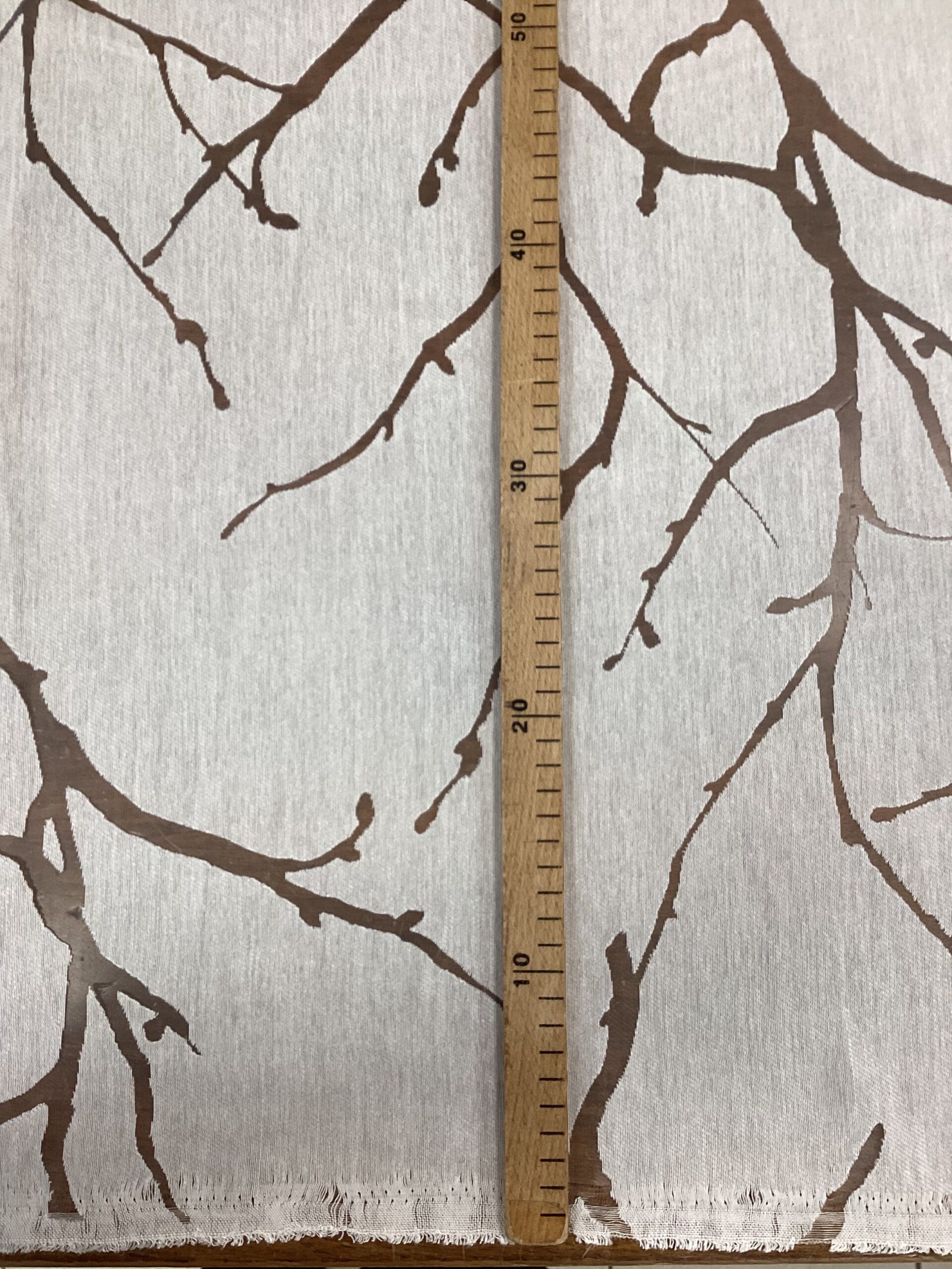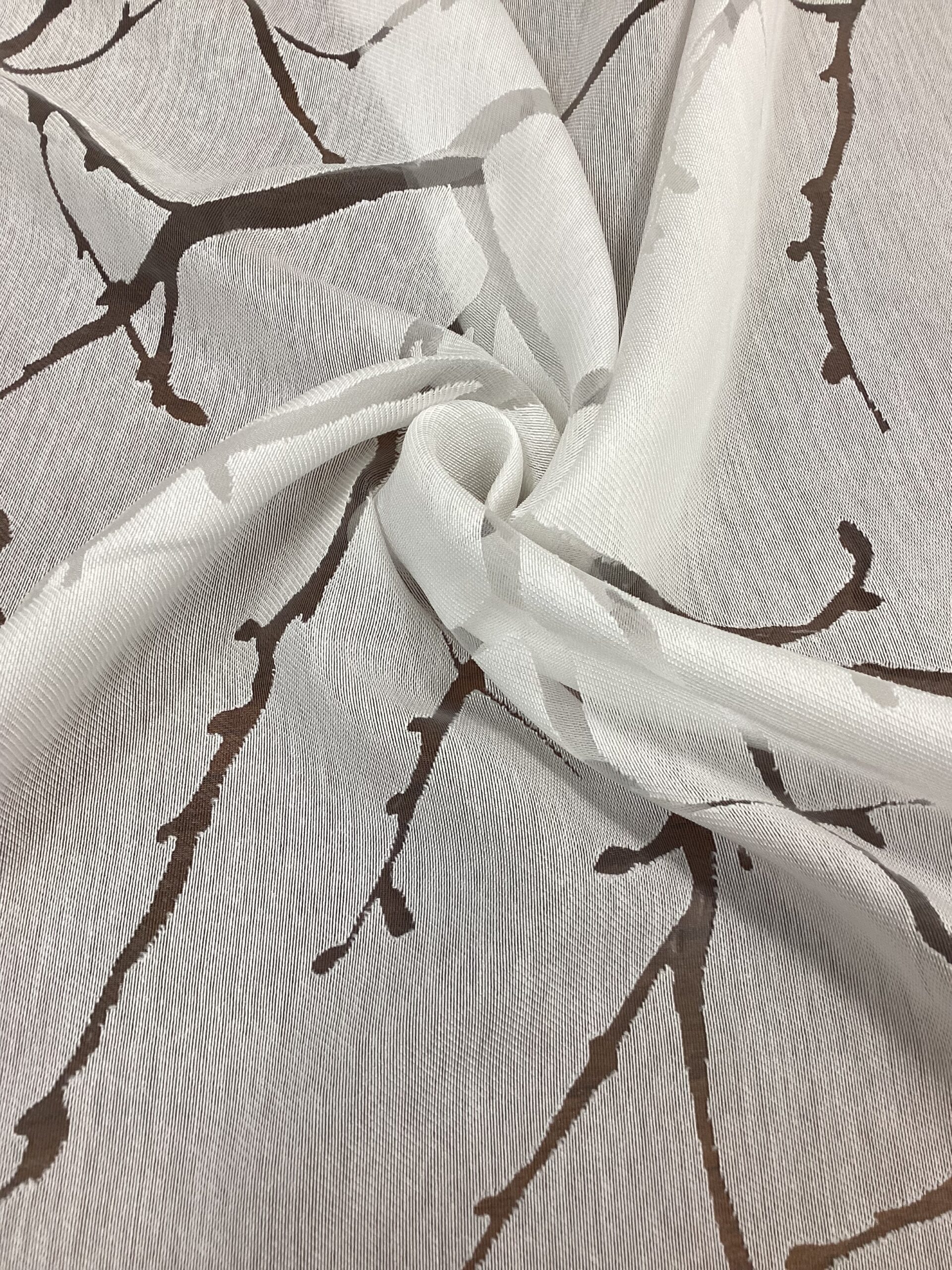 Raffinato ed elegante, questo tessuto per tendaggi da interno presenta una base bianca luminosa arricchita da un delicato disegno in trasparenza che richiama rami di frutteto in fiore. Le sottili ramificazioni, con foglioline e boccioli stilizzati, donano un tocco naturale e arioso all’ambiente, creando un gioco di luci e ombre quando il tessuto è colpito dalla luce.