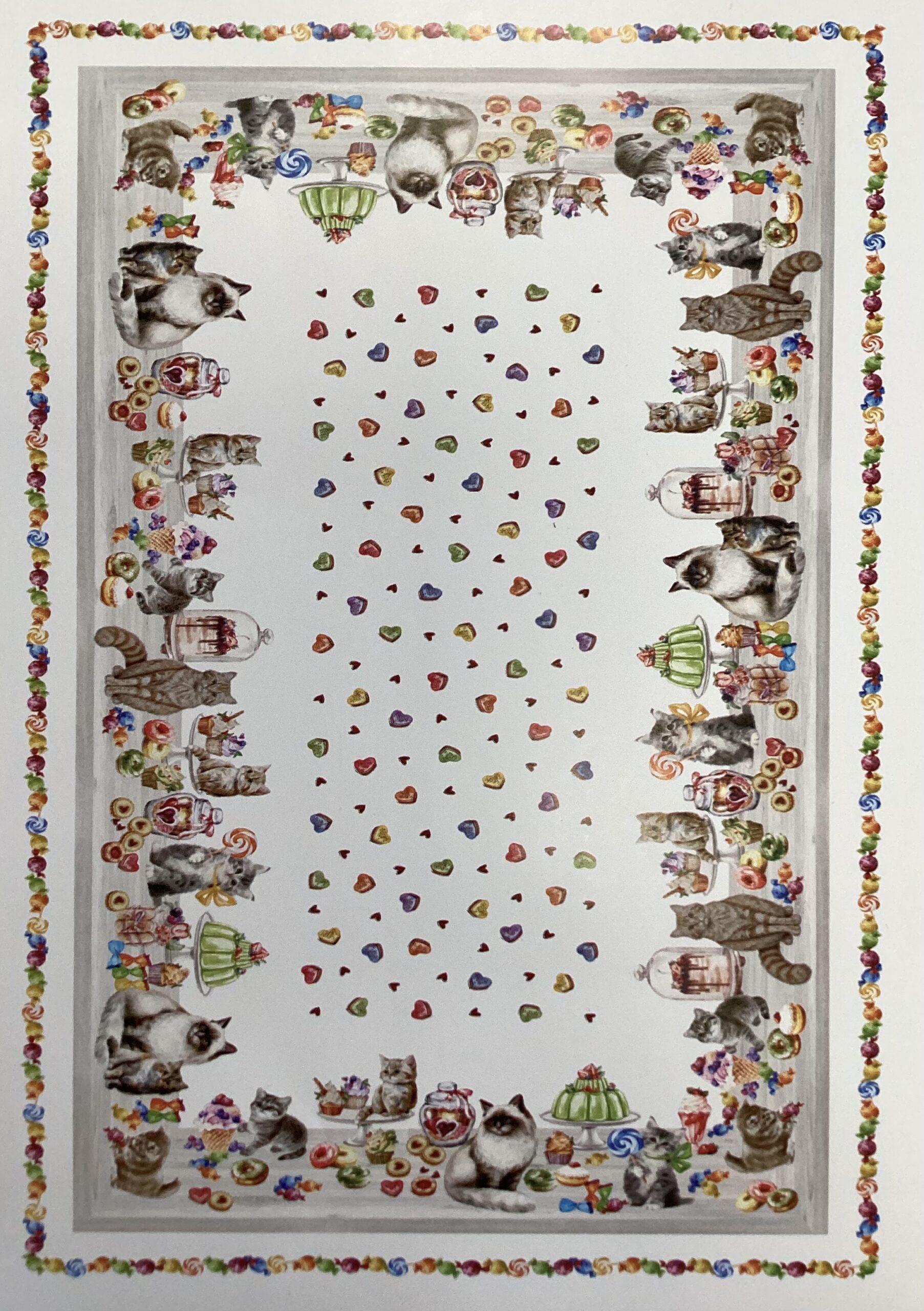 La tovaglia in puro cotone presenta un allegro e simpatico disegno di gatti e dolci, che si intrecciano su tutta la superficie. I gatti, dai contorni morbidi e giocosi, sono raffigurati in pose dinamiche, creando un’atmosfera divertente e accogliente. Il design è semplice ma vivace, ideale per dare un tocco di originalità e leggerezza alla tua tavola.