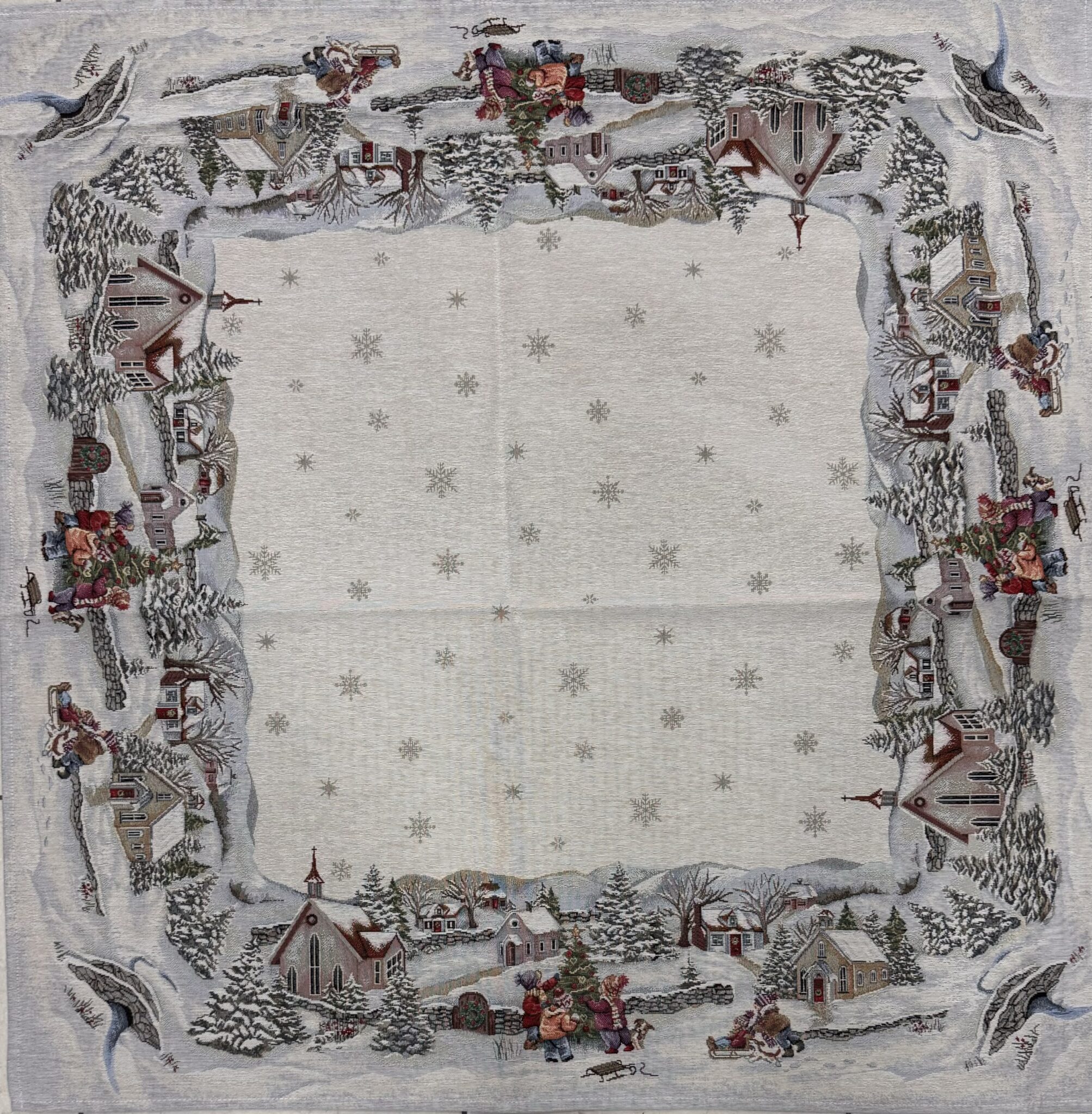 Questa tovaglia in tessuto gobelin con una composizione di cotone misto poliestere, presenta una scena tipica del periodo invernale.