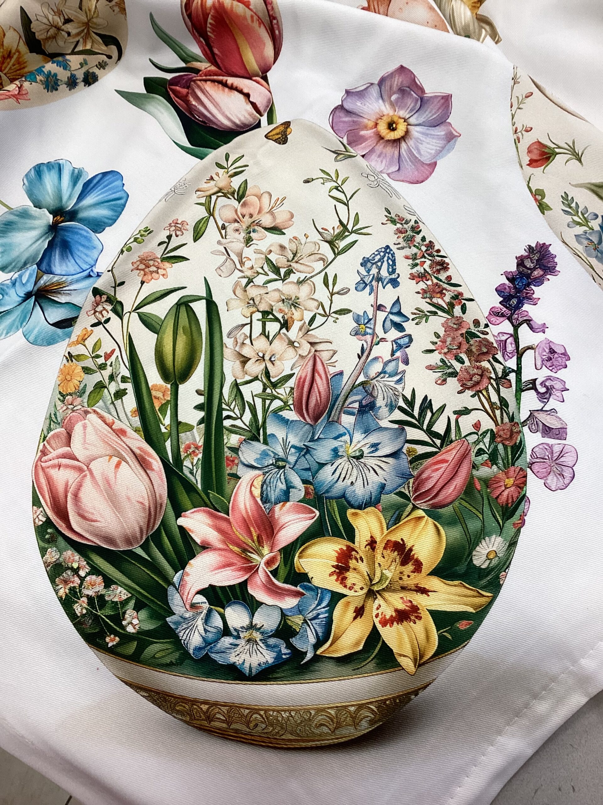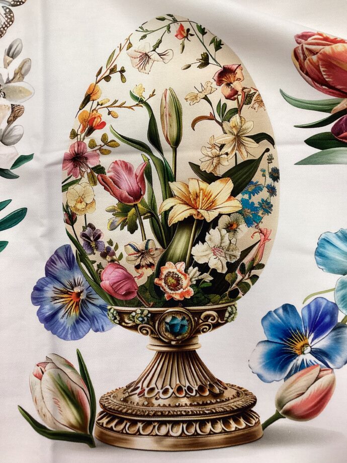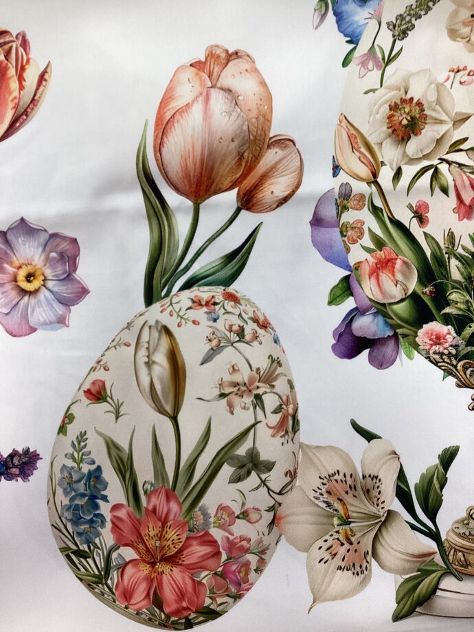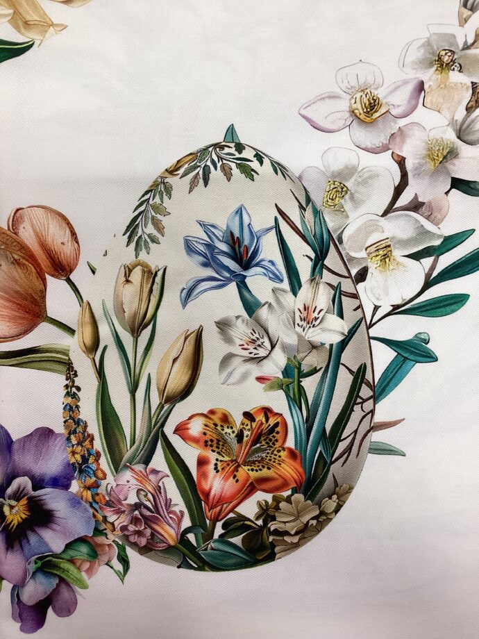 Immagina una tovaglia bianca su cui spiccano uova dipinte con delicate sfumature di colori pastello. Le uova sono adornate con disegni di iris arancioni e tulipani fucsia, che contrastano elegantemente con la purezza del bianco. La stampa digitale conferisce un aspetto vivace e moderno, con dettagli ben definiti che rendono ogni fiore e ogni uovo visibile in modo nitido. Un design fresco e primaverile, perfetto per decorare una tavola allegra e sofisticata.