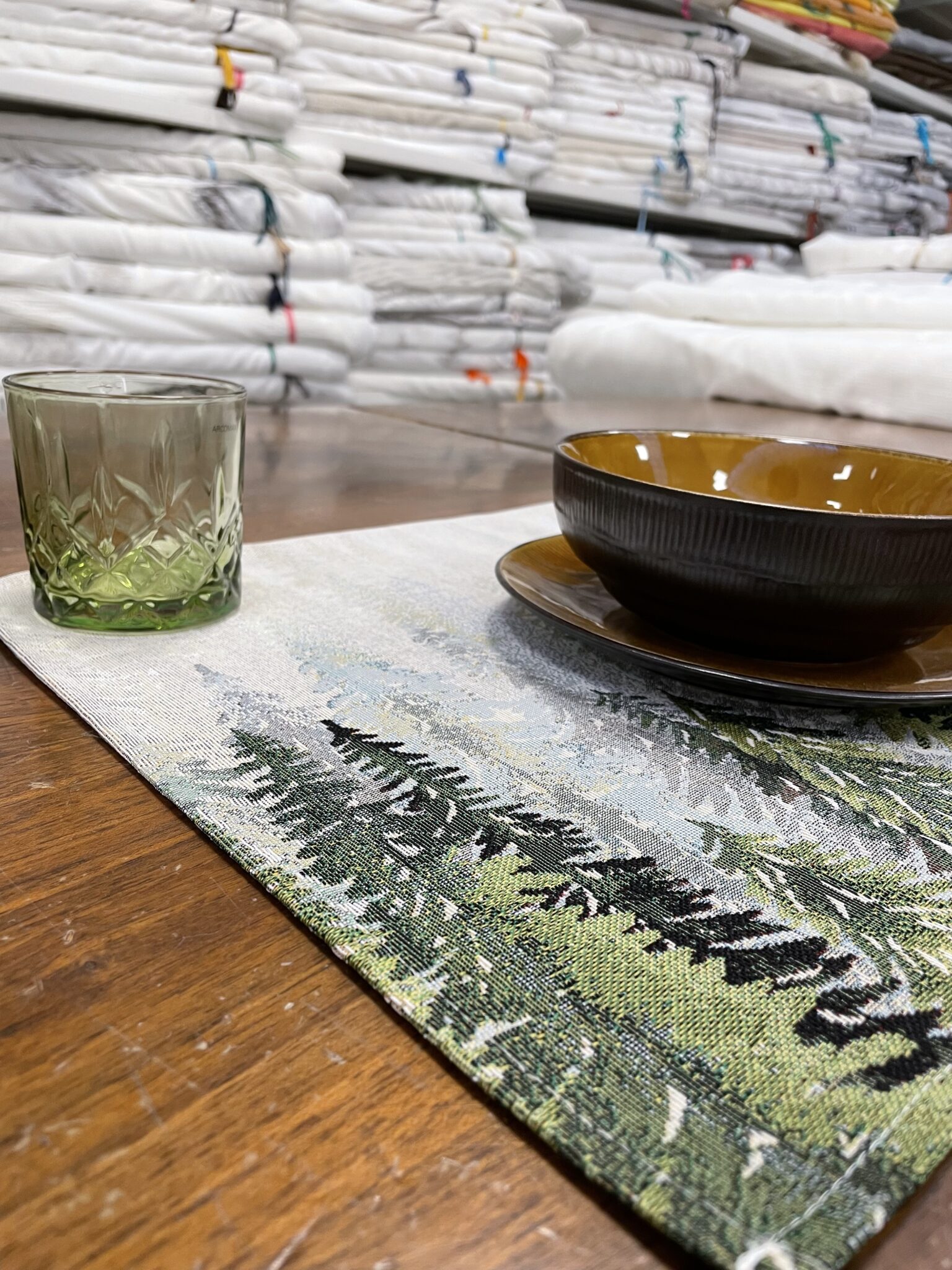 Realizzata in un mix di cotone e poliestere, questa tovaglietta unisce morbidezza e resistenza, garantendo una lunga durata. Il design raffinato, con un un paesaggio boschivo con alberi di conifera, avvolti in una leggera nebbia crea un’atmosfera suggestiva.