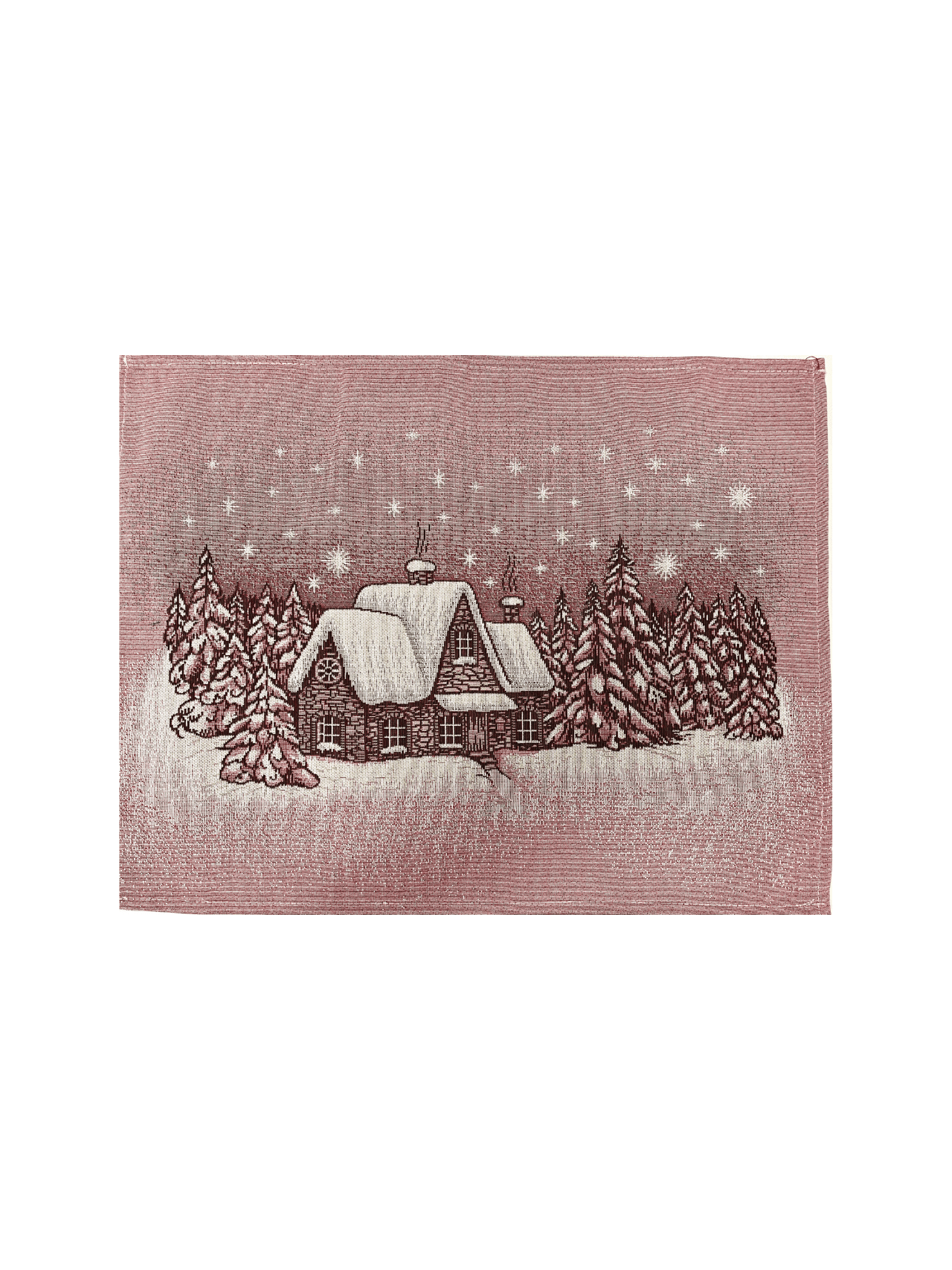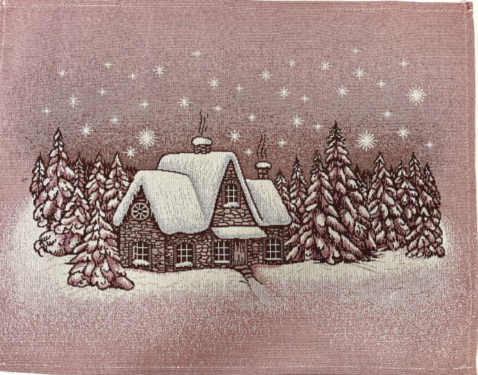 Tovaglia in tessuto gobelin cotone misto poliestere con chalet innevato su sfondo rosa, risulta ideale per un’atmosfera calda e accogliente.